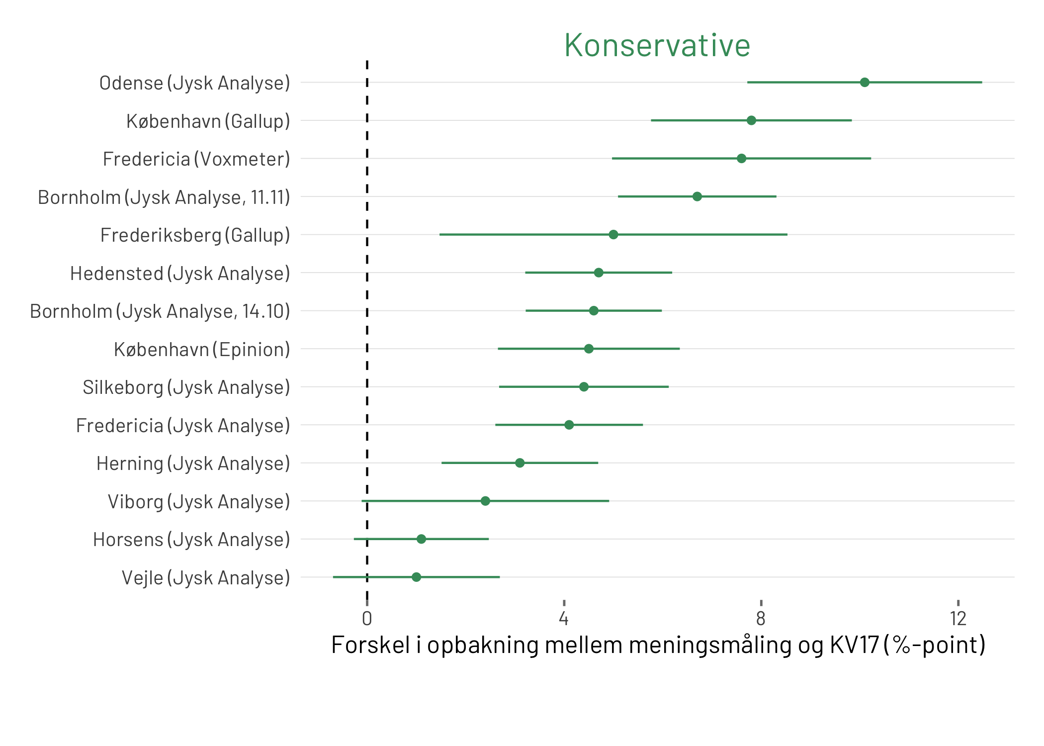 Konservative står til fremgang i alle kommuner, hvor der er lavet meningsmålinger. Størst er fremgangen i Odense. Lavest er fremgangen i Vejle og Horsens.