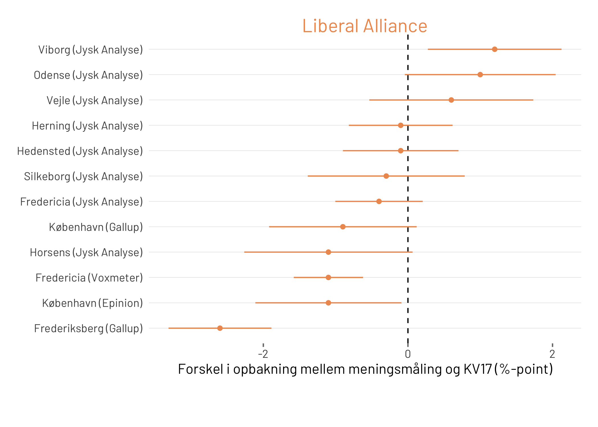 Der er blandede resultater til Liberal Alliance. Fremgang ser vi i Viborg. Tilbagegang i målingerne ser vi i målingerne fra Frederiksberg, København og Fredericia.