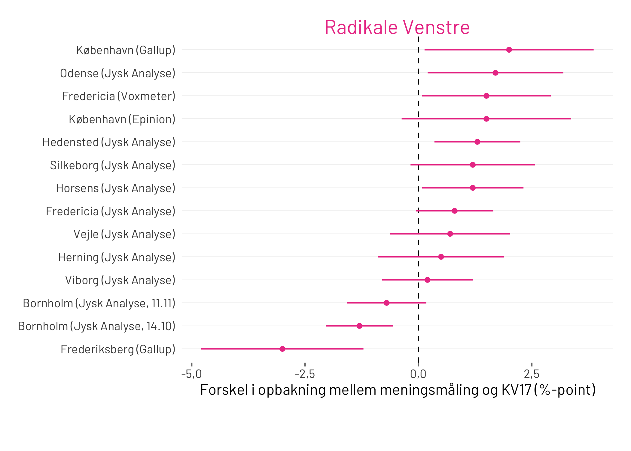 Der er ligeledes blandede resultater til Radikale Venstre. Der er en lille fremgang i flere kommuner (København, Odense, Fredericia, Hedensted m.fl.), og en lille tilbagegang i målingerne fra Frederiksberg og Bornholm.