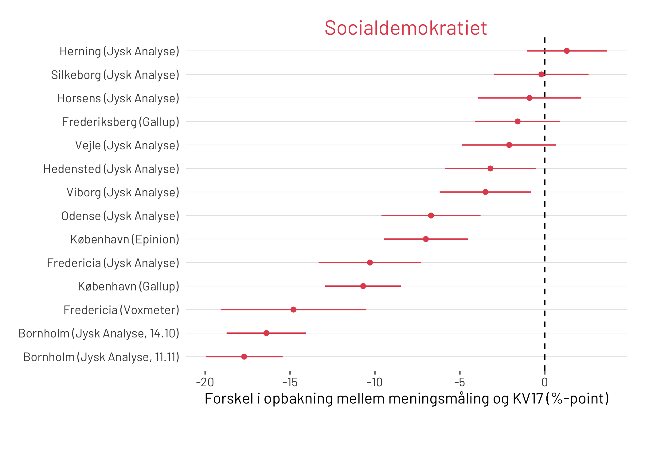 Socialdemokratiet står generelt til tilbagegang. Størst er tilbagegangen på Bornholm, i Fredericia og i København. Ingen signifikant fremgang i de lokale målinger (hvis man tager den statistiske usikkerhed i betragtning).