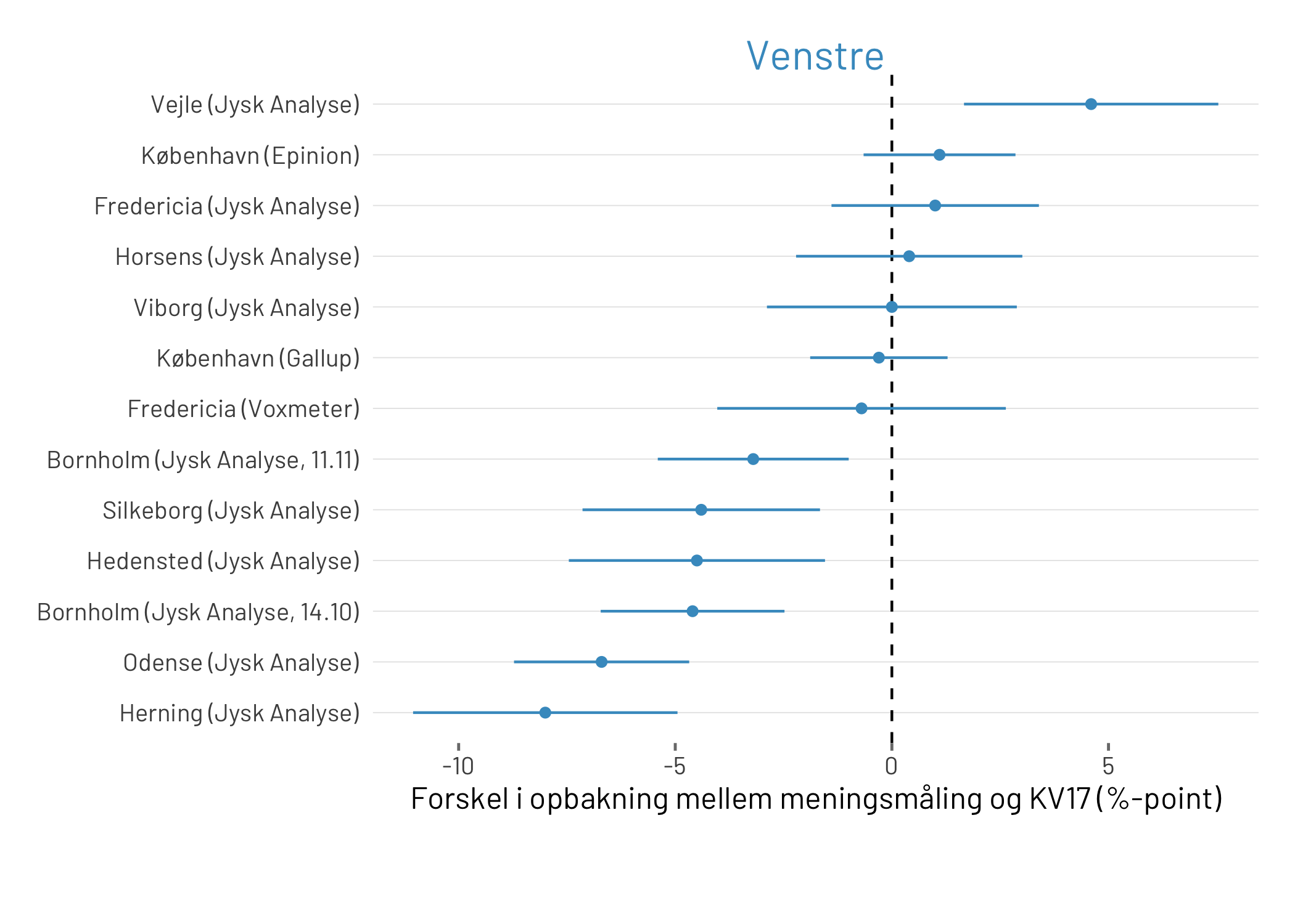 Min plan er at følge op på dette indlæg efter valget med en analyse af, hvor godt de lokale målinger klarede sig. Der er dog et par vigtige forbehold, man skal holde sig for øje allerede nu. For det første er der mange tvivlere i de respektive målinger. De er derfor også hæftet med en stor grad af usikkerhed (større end den statistiske usikkerhed, der formidles). For det andet er de som altid et øjebliksbillede. De fleste målinger spørger ind til, hvem man ville stemme på, hvis der var valg i morgen, og det er ikke nødvendigvis de partier, vælgerne ender med at stemme på ved valget. For det tredje er det ikke tilfældigt, hvilke kommuner, der bliver foretaget meningsmålinger i. Man skal derfor være påpasselig med at kigge på ovenstående figurer og generalisere til samtlige 98 kommuner. For det fjerde - og vigtigst af alt - er der en større sandsynlighed for, at de lokale målinger kan tage fejl, end når vi kigger på meningsmålinger til folketingsvalget. Vær derfor åben for, at der kan komme op til flere overraskelser på tirsdag, der divergerer fra de resultater, vi kan se i meningsmålingerne.