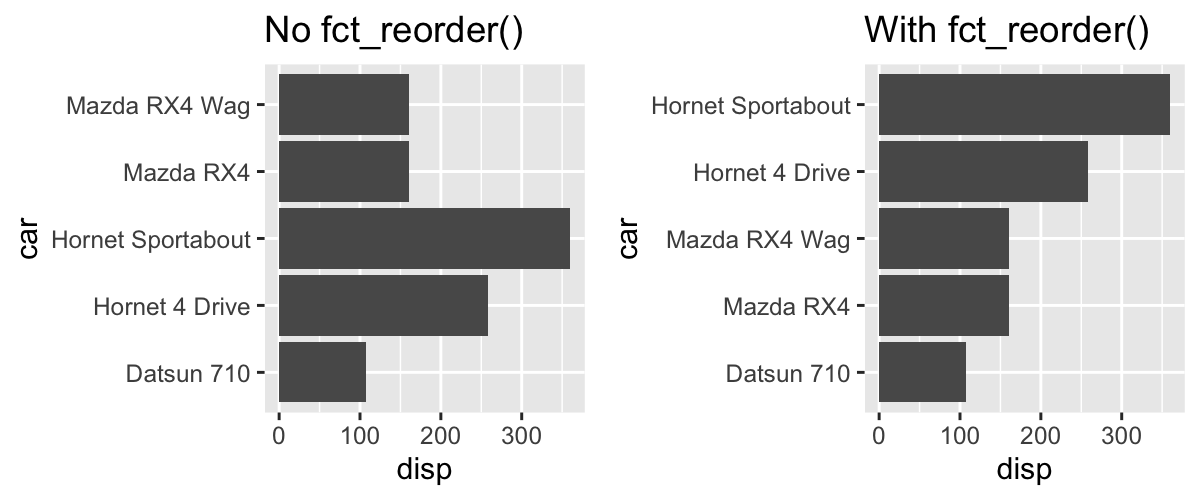 The forcats package has a lot of great functions. The one I use the most is the fct_reorder() function. I have also seen David Robinson using it a lot in his YouTube videos (I recommend his videos in this post).