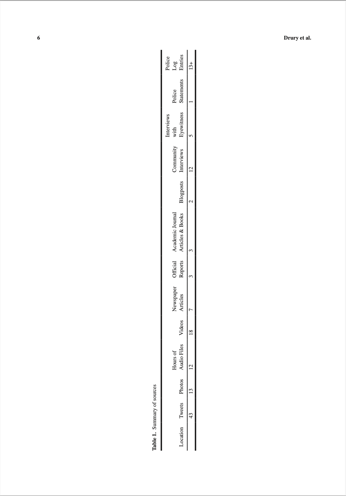 The sources are 43 tweets, 13 photos, 12 hours of audio files, 18 videos, seven newspaper articles, three official reports, three academic journal articles and books, two blogposts, 12 community interviews, one police statement, and more than 13 police log entries.