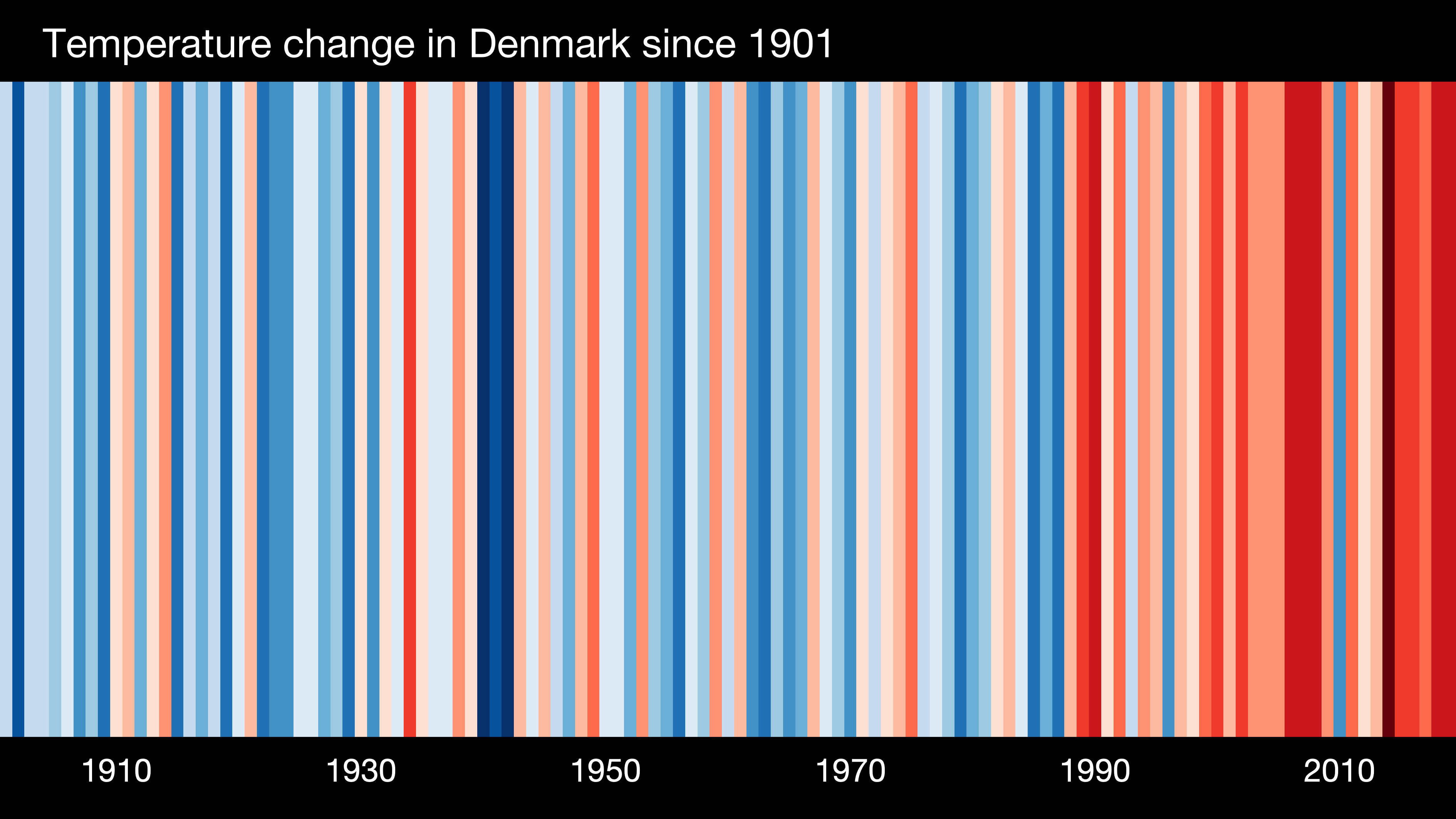 Second, I am not convinced that the tool is actually good if you want to show your stripes (and that is what we are being told to do afterall). How useful is the visualisation when we go beyond the global averages? To illustrate my concern, here is the visualisation I got for Denmark: