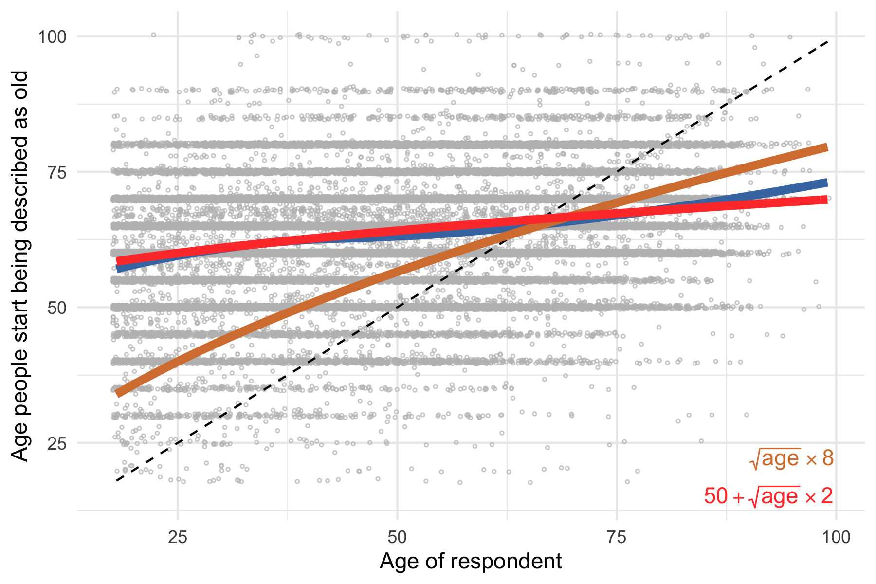 For that reason, I decided to look at the data again and explore whether I can propose an alternative equation based on the data. As the trend seems to be linear, one possibility is to simply use the regression coefficients from a linear model. Here our rule will be 56.02 + 0.15 * age. That is, by putting in your own age in the equation, you can get a good sense of what people, being your age, on average, considers old.