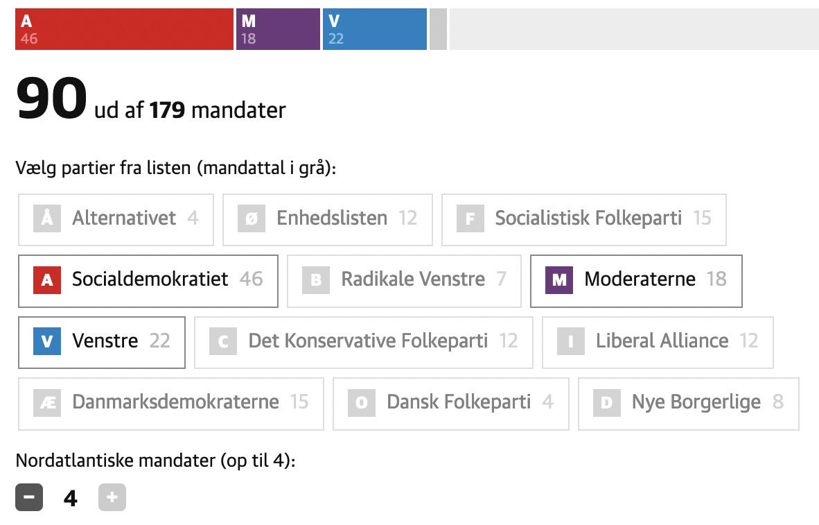 Du kan desuden også vælge blandt udvalgte konstellationer, hvor der gives en analyse af, hvad der er vigtigt at holde for øje ved de specifikke konstellationer. Bemærk at du ligeledes kan tilføje op til fire nordatlantiske mandater.