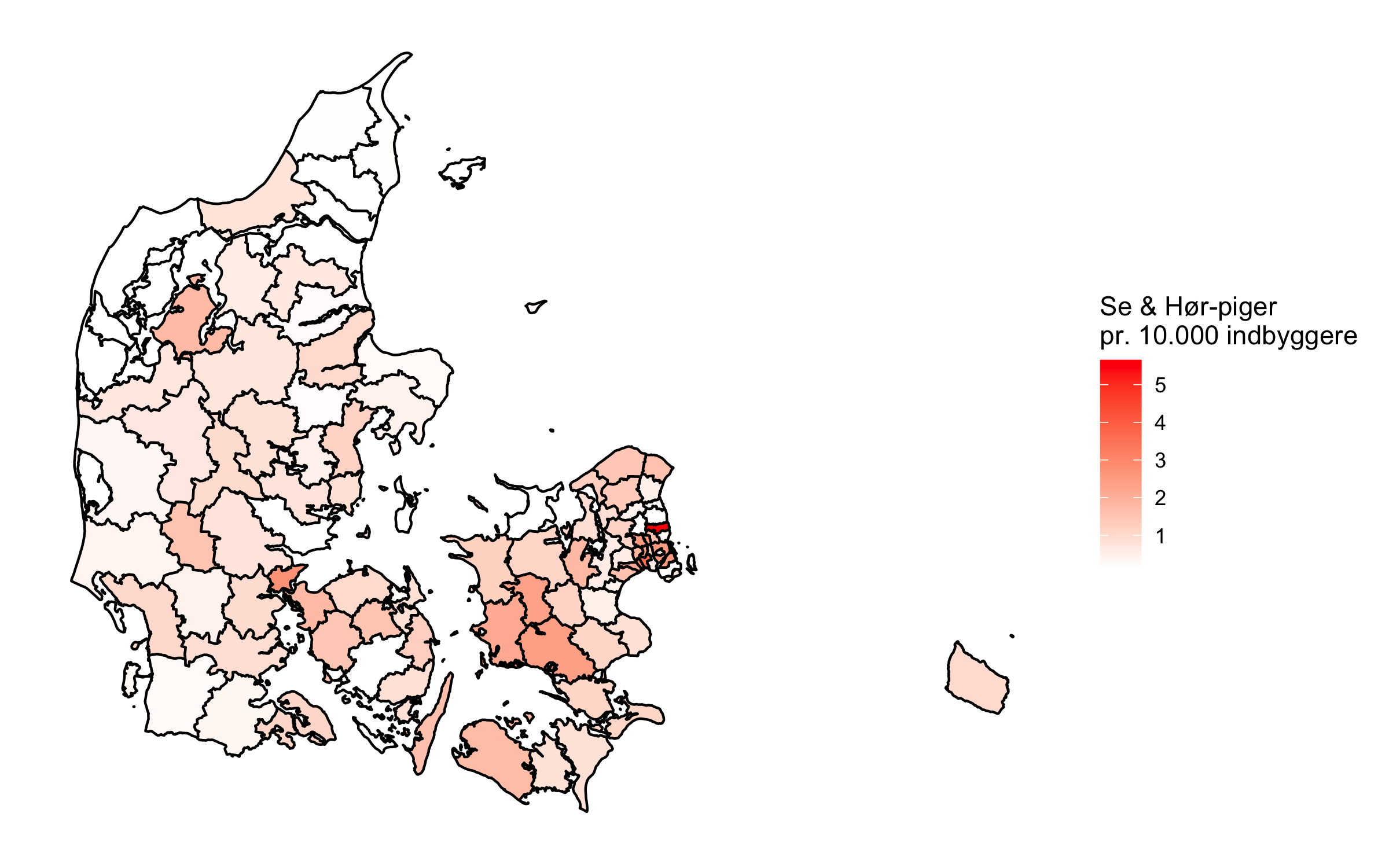 Nedenstående kort viser antallet af Se & Hør-piger pr. 10.000 indbyggere. Det er ingen overraskelse, at København har de fleste Se & Hør-piger, men da der også bor mange i København, har de ikke flest Se & Hør-piger per capita. I stedet kommer de ind på en 6. plads med 2,54 Se & Hør-piger per capita.