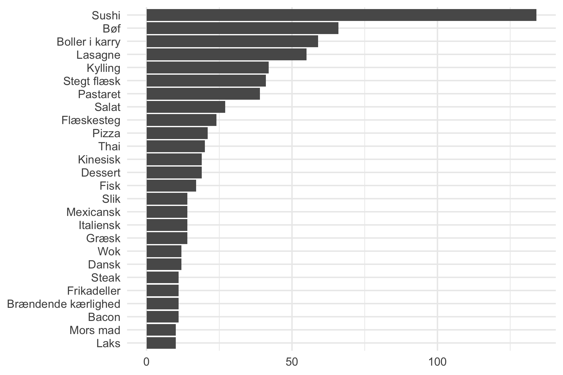 Sushi er en sikker vinderHvilke livretter har Se & Hør-pigerene? Set fra et dataperspektiv prioriterer Se & Hør at have så detaljerede data på kvindernes livretter som overhovedet muligt. Det betyder dog, at det kræver lidt kodearbejde at kategorisere de forskellige livretter. Eksempelvis slog jeg alle svar der indeholdt slik, flødeboller, vingummi, lakrids og karamel sammen til én slikkategori. Der er også mange svar, jeg valgte ikke at give en bestemt kategori, eksempelvis "Alt, der kan spises bearnaisesovs til", "Hvad end manden laver i køkkenet" og "Frække deller".
