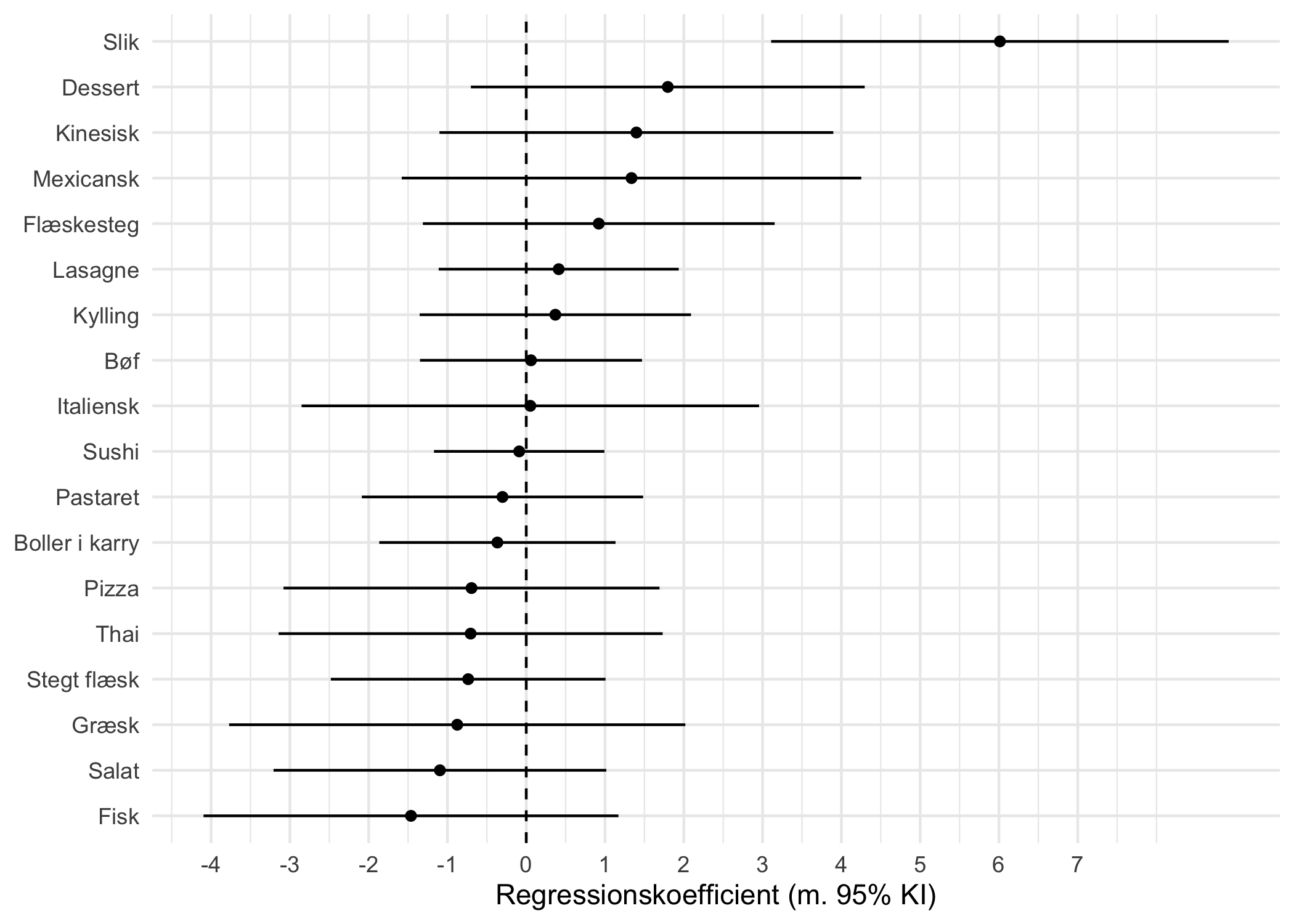 Vi ser at livretter som slik og dessert korrelerer positivt med modellernes vægt, men det er kun slikvariablen, der har en statistisk signifikant koefficient. Konkret vejer de modeller, der angiver slik som deres livret, alt andet lige, omkring 6 kg mere. Livretter som salat og fisk har en negativ koefficient, men ingen af disse er statistisk signifikante.