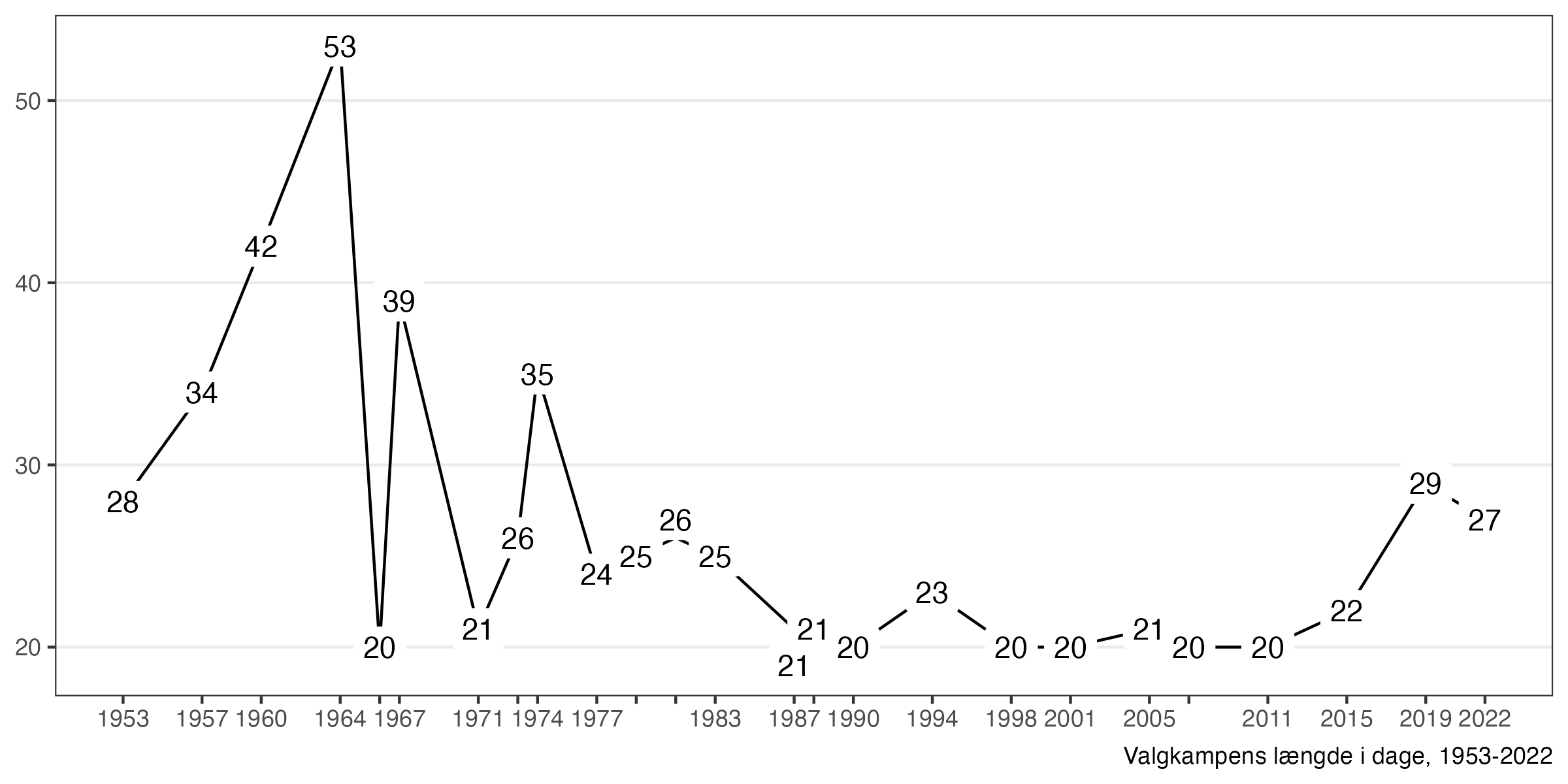 Valgkampen vil i år være 27 dage. Det er en lang valgkamp, men ikke længere end i 2019, hvor den var 29 dage.