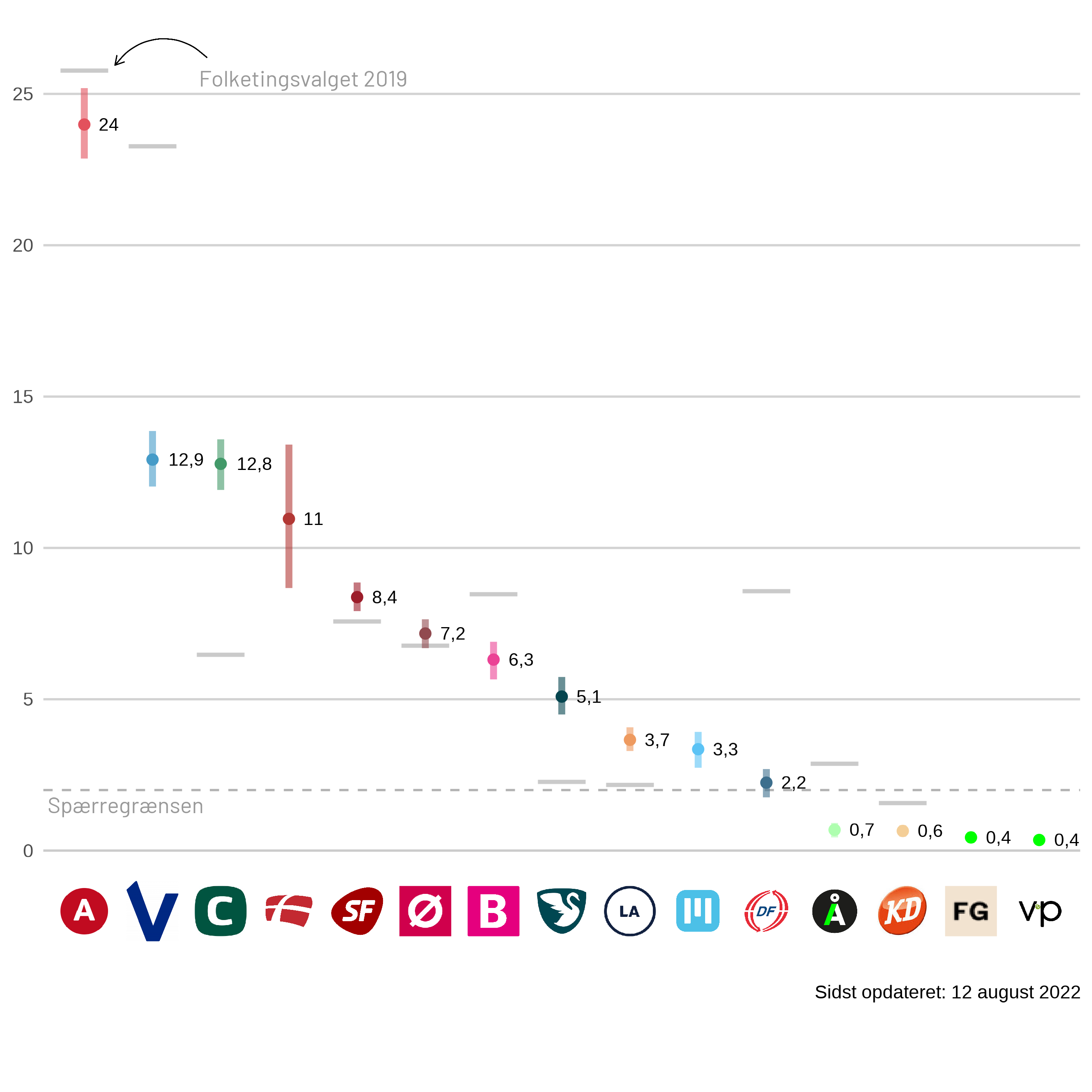 Det bedste bud er at partiet står til at få 11% af stemmerne. Det er ikke overraskende, når vi ser, at institutterne giver forskellige bud på en opbakning mellem 10 og 12%. Bemærk dog at usikkerheden i snittet er betydelig, da vi kun har en håndfuld målinger med partiet. Når vi kan inkludere flere målinger i snittet, vil usikkerheden falde. Jeg havde desuden gerne set at partiet havde valgt et andet logo end det danske flag, men sådan skal det åbenbart være.