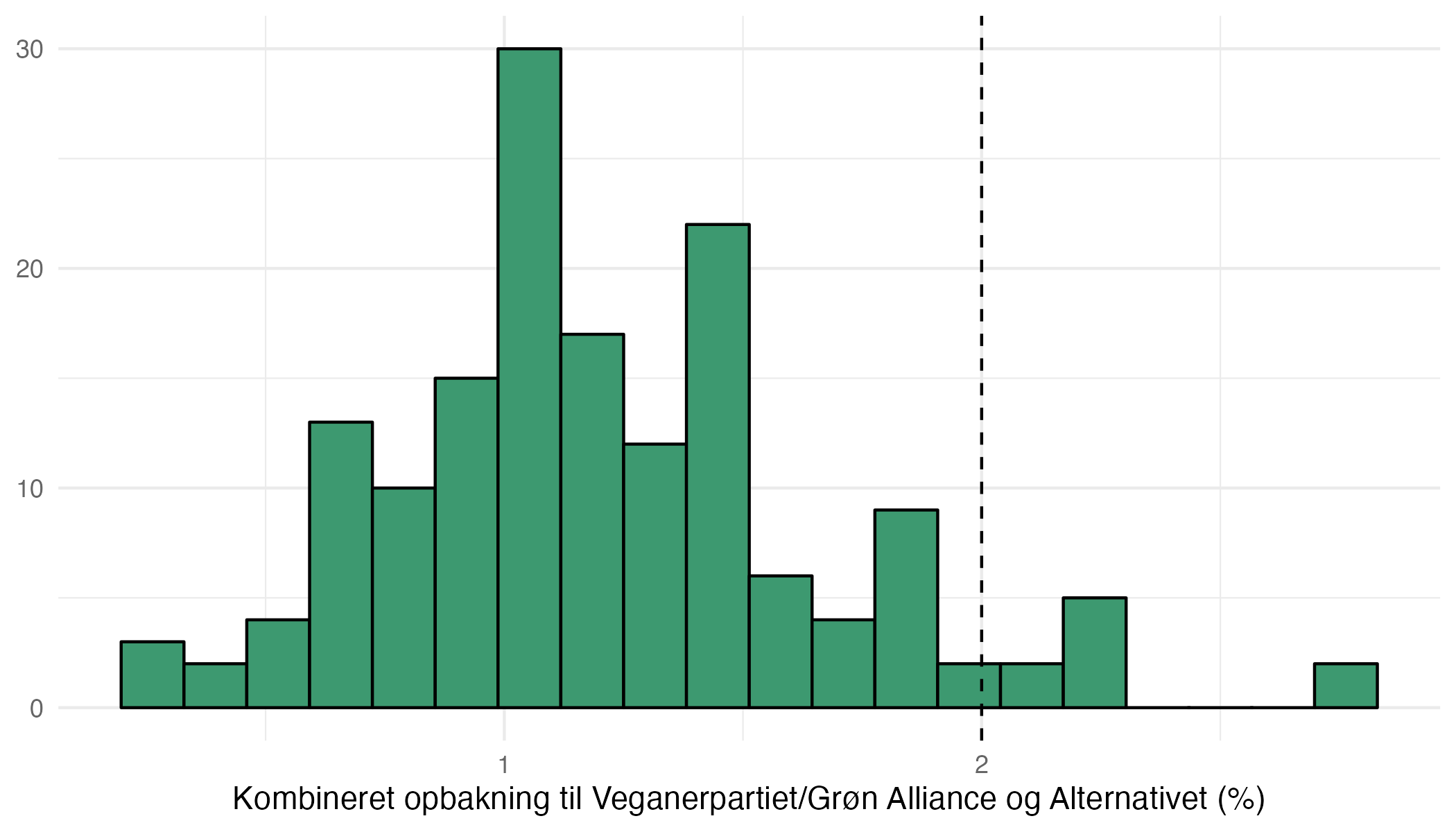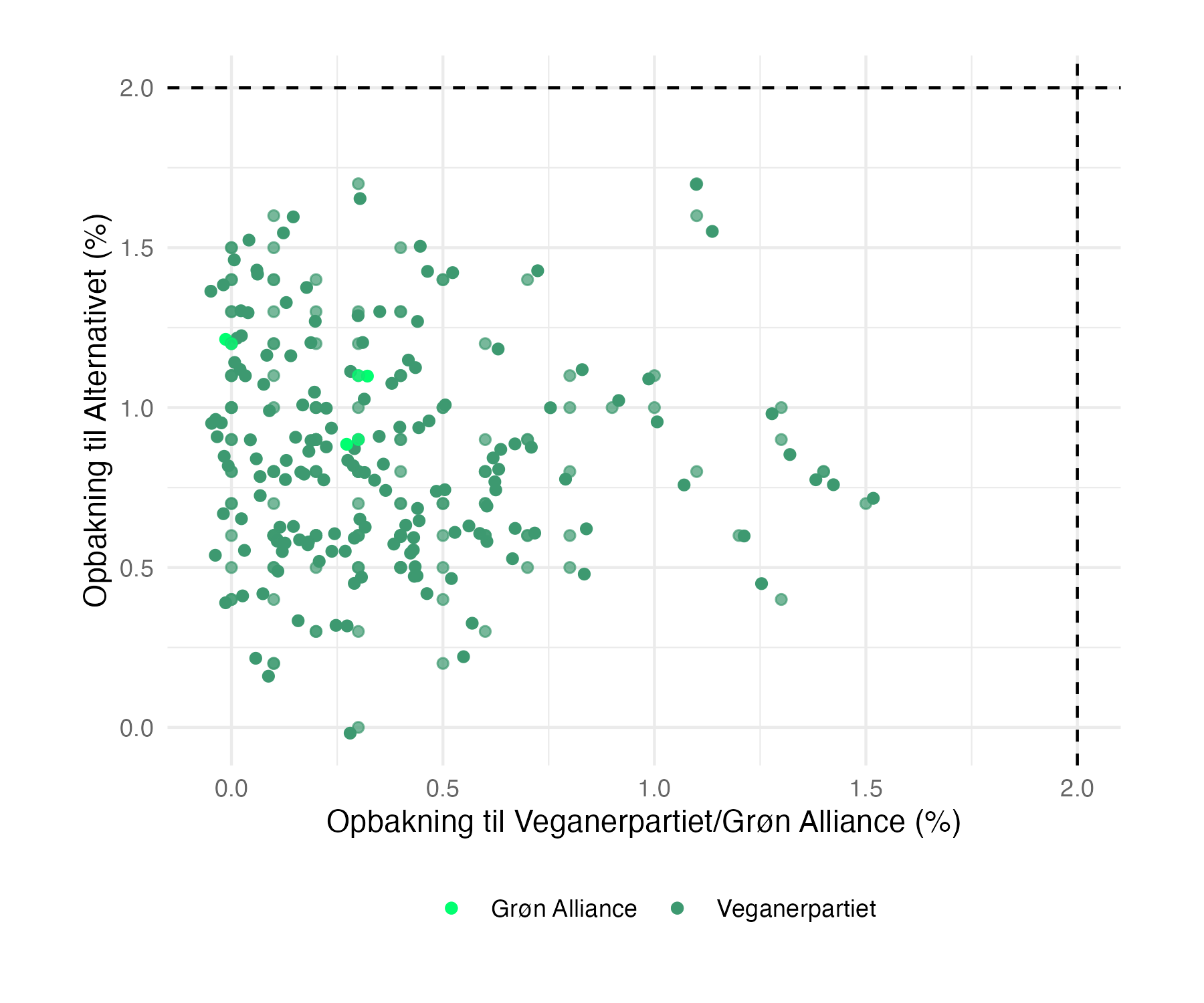Vi ser i figuren, hvor de stiplede linjer indikerer spærregrænsen på 2%, at ingen af partierne ramte de magiske 2%. Det var dog Alternativet der var tættest på, hvor flere målinger gav dem en opbakning, der var større end 1,5%. Jeg har i figuren fremhævet de meningsmålinger, der blev foretaget efter Veganerpartiet blev til Grøn Alliance, men heller ikke i disse målinger var partiet ikke i nærheden af 2%.