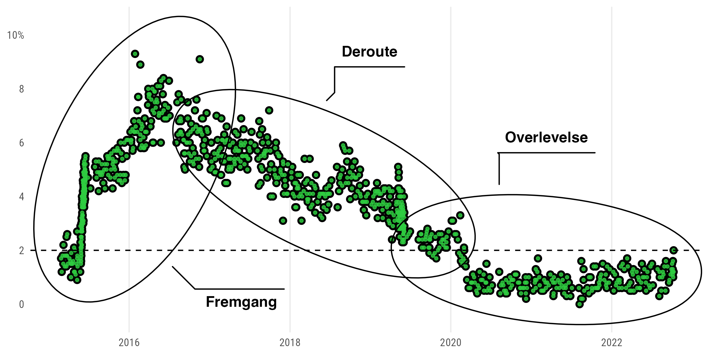 Hvis vi kigger på meningsmålingerne for Alternativet nu er der tale om tre forskellige perioder: 1) fremgang (2015/2016), 2) deroute (2016/2020) og 3) overlevelse (2020-).