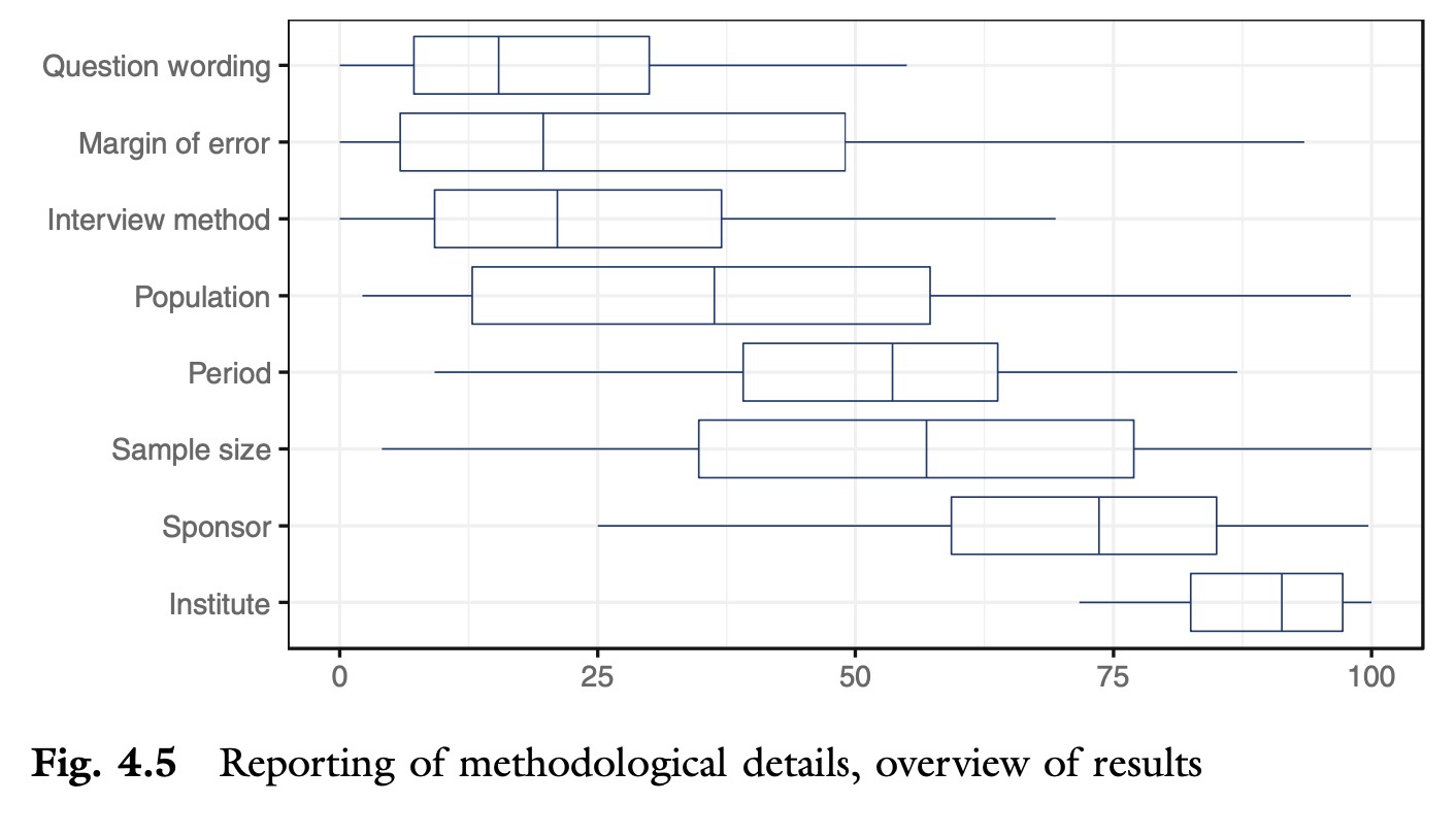 Second, the quality of the coverage of opinion polls can, on average, be improved. Ten years ago, following the 2011 Danish general election, Simon Straubinger and I conducted an analysis of the quality of the coverage of opinion polls. We found significant differences in the extent to which media outlets in Denmark report methodological details when covering opinion polls. In the book, Zoltán Fazekas and I reviewed 30 published studies analysing the reporting of methodological details in the coverage of opinion polls (Table 4.6 in the book provides an overview of all studies with information on the country of the study, the time period, number of articles, the media, as well as the campaign context). For each of the studies we collected information on nine features: whether they reported a sponsor (media outlet commissioning the poll), sample size, question wording, population, period, statistical uncertainty/margin of error, interview method (e.g. phone interviews) and institute (polling firm). If a study provided such information, we coded how many of the articles in the analysis reported this information (as a percentage). Of course, there are many other features that could be included, but we found these nine to be most important (see Table 4.1 in the book for an overview of different types of methodololgical information and their inclusion in different methodological standards). Figure 4.5 in the book provides an overview of how often methodological details, on average, are included in the coverage of opinion polls based upon the evidence presented in the 30 studies: