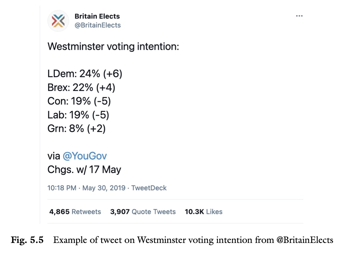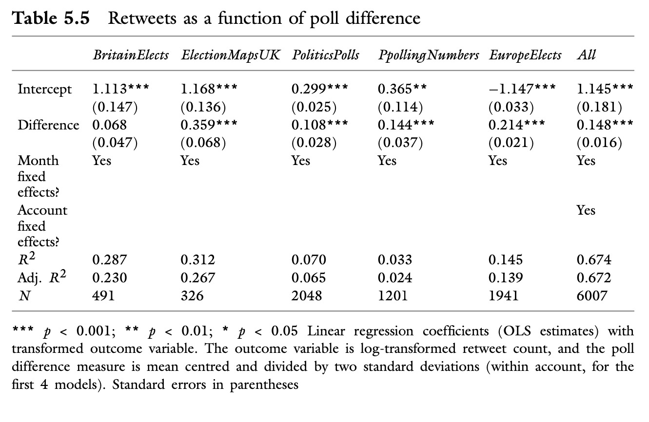We collected the most recent tweets from these accounts using Twitter’s API and the rtweet R package. This gave us information on the number of retweets each of these tweets had at the time of the data collection. The most recent tweets were collected on 25 January 2021, and the data on retweets reflects the numbers at that time. For each tweet where we could get information on a change in percentage points, we extracted this change and kept the largest change. In the above tweet, for example, the largest change was 6. In a series of regression models, we regressed the number of retweets on the maximum change in the poll. The results are provided in Table 5.5 in the book.