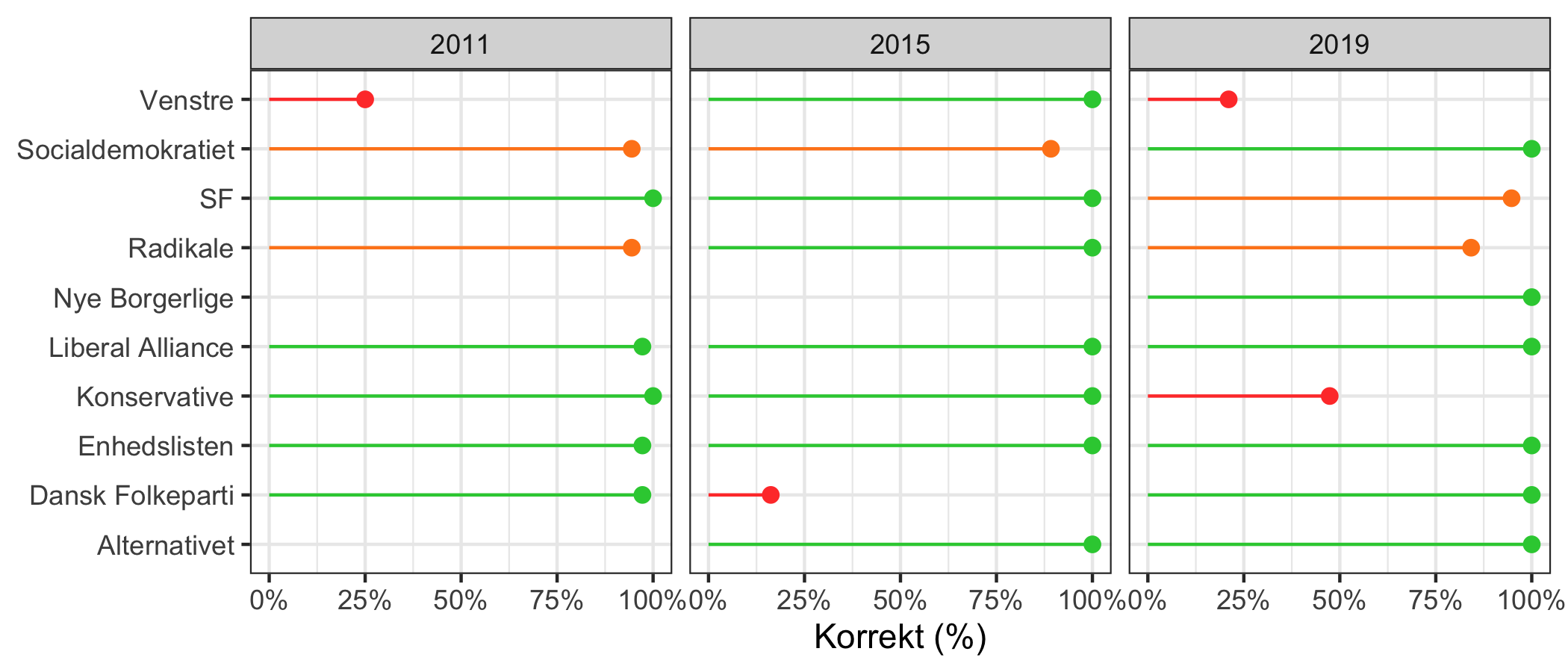 Meningsmålingerne rammer dog sjældent et valg helt perfekt. Der er ofte et eller flere partier, hvor meningsmålingerne har svært ved at ramme rigtigt, her forstået som at ramme et parti inden for den statistiske usikkerhed i målingen. I 2011 ramte mange målinger forkert ift. Venstre, i 2015 havde målingerne svært ved at ramme opbakningen til Dansk Folkeparti og i 2019 ramte målingerne opbakningen til Venstre forkert igen. I 2020 præsenterede jeg nedenstående figur i et indlæg, hvor man kan se, hvor ofte meningsmålingerne ramte rigtigt ved de respektive partier.