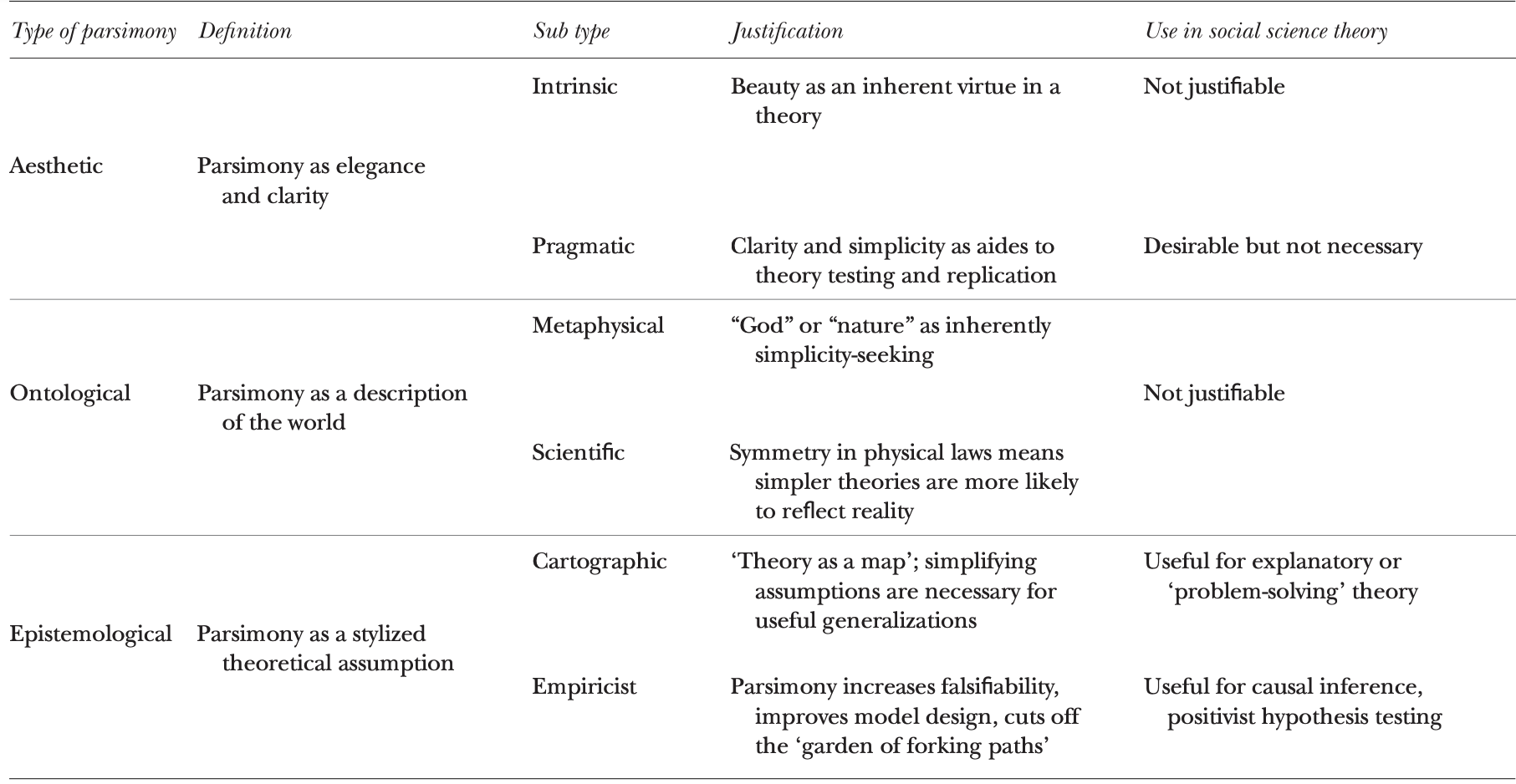 A good simple model is parsimonious. Gunitsky (2019) identities three different conceptions of parsimony. First, the aesthetic conception (a theory’s elegance and clarity). Second, the ontological conception (the world is governed by simple fundamental laws). Third, the epistemological conception (abstracting from reality to highlight recurring patterns and build testable propositions). When we talk about maps as simplifications, we are often talking about the third conception of parsimony. In the table in the paper, there is a great overview of the different types of parsimony and how they relate to social science theory.