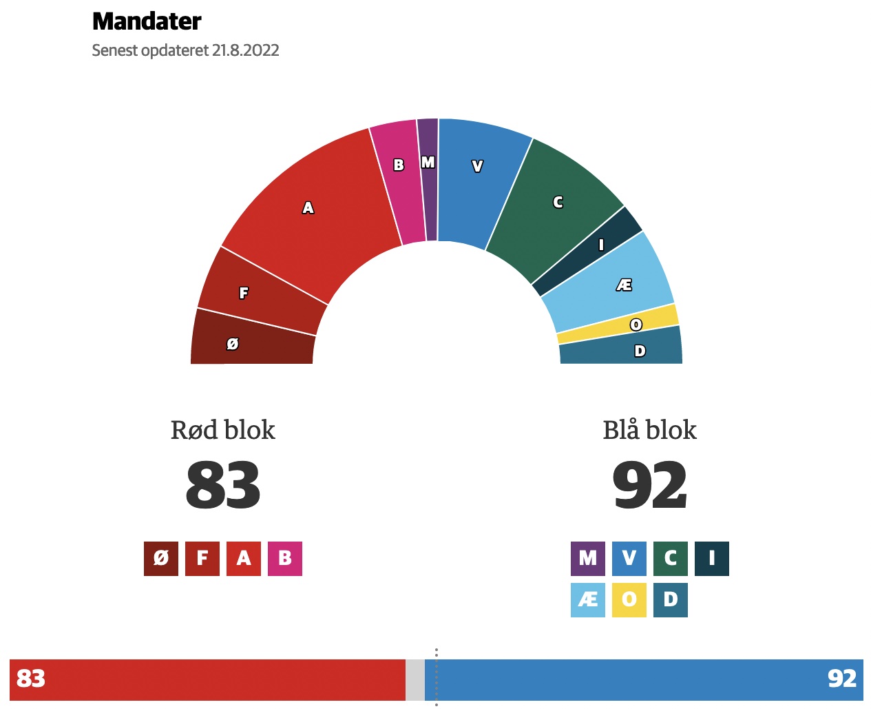 Som sagt er det muligt at se mandatfordelingen med og uden Moderaterne. For figurren hvor Moderaterne er med i blå blok, ser figuren ud som følger: