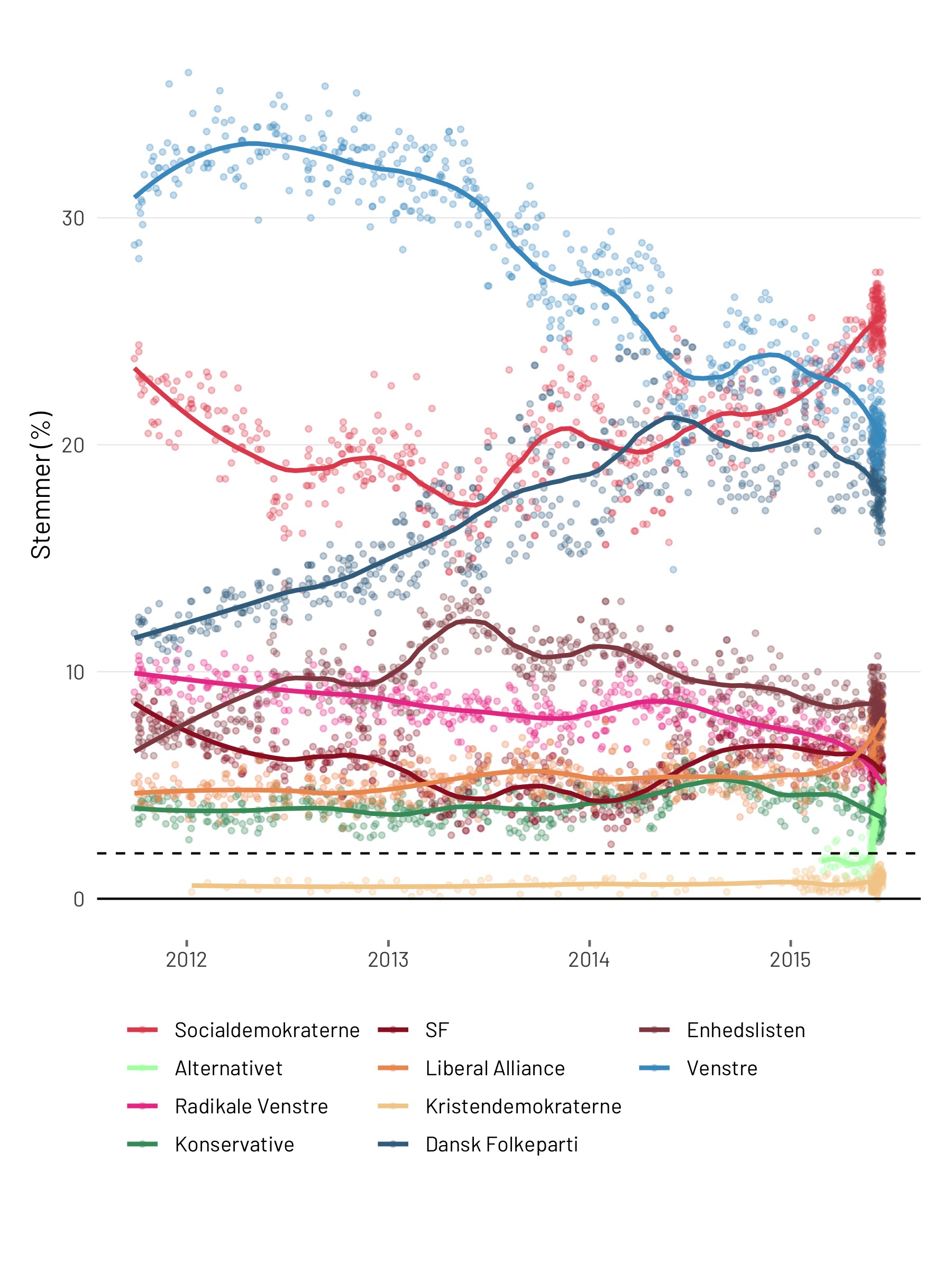 Der er flere der har efterspurgt, at det bliver lettere at se mere end de seneste 75 meningsmålinger. Derfor har jeg lavet separate sider, hvor man let kan få et overblik over meningsmålingerne fra de seneste valgperioder (inklusiv indeværende valgperiode). Her er eksempelvis en figur med meningsmålinger i valgperioden 2011-2015: