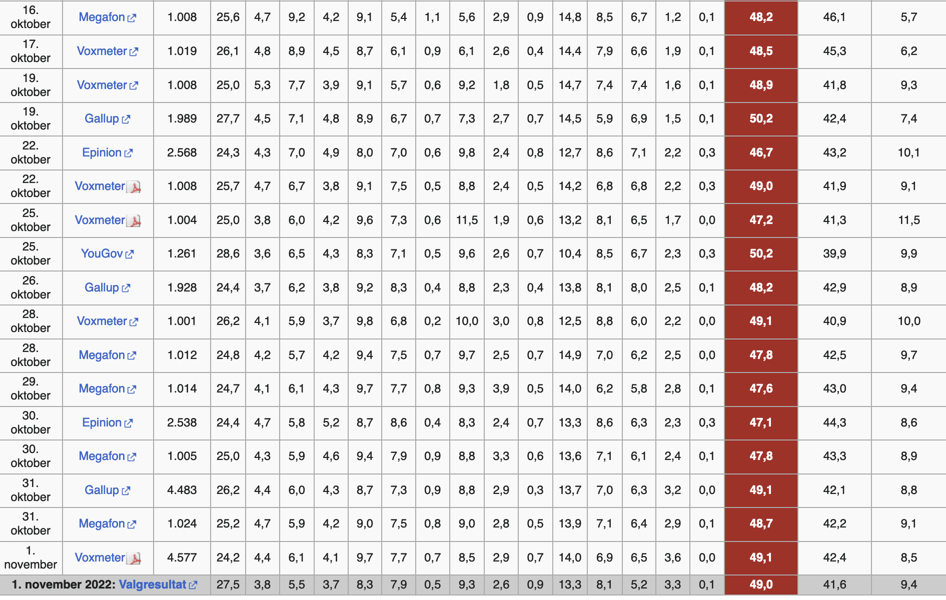 Her kan du normalt finde et overblik over meningsmålingerne, et vægtet gennemsnit af meningsmålingerne samt en oversigt over huseffekter i meningsmålingerne. Dette overblik er desværre lukket på ubestemt tid. Konkret venter jeg afklaring på, om jeg skal betale en millionerstatning til Megafon på baggrund af mit arbejde med Politologi.dk. Min intention med siden har udelukkende været at stille en ressource til rådighed kvit og frit for journalister, forskere, politisk interesserede borgere og andre, der ønsker et samlet overblik over meningsmålingerne. Megafon har krævet at deres meningsmålinger fjernes fra overblikket samt fremlagt et krav på erstatning og vederlag for, at jeg har indsamlet og delt deres meningsmålinger. Jeg deler ikke den overbevisning, at et analyseinstitut skal kunne kræve, at deres meningsmålinger ikke bliver delt offentligt og underlagt en faglig, metodisk og systematisk vurdering. Jeg finder det særdeles problematisk, at et analyseinstitut kan reducere muligheden for at kunne vurdere kvaliteten af meningsmålingerne. Givet hvad vi ved om meningsmålingernes demokratiske effekter, finder jeg det problematisk, at analyseinstitutterne kan diktere, om deres meningsmålinger må bruges til andet formål end markedsføring af deres produkter. På den baggrund har jeg valgt at lukke Politologi.dk til der er en juridisk afklaring omkring hjemmesidens fremtid. Det er ikke af egen fri vilje, at jeg lukker siden, men jeg ser ingen anden løsning. Siden har været frit tilgængelig for offentligheden i flere år, og det har udelukkende været en udgift at drive Politologi.dk (både hvad angår tid og penge), hvorfor jeg desværre ikke har mulighed for at betale Megafon et femcifret beløb for hver Megafon-måling, jeg inkluderer. Tak for nu, især til alle de brugere, der har givet positiv feedback og konstruktiv kritik på hjemmesiden i løbet af de seneste år. Mvh. Erik Gahner Larsen 2. november 2022