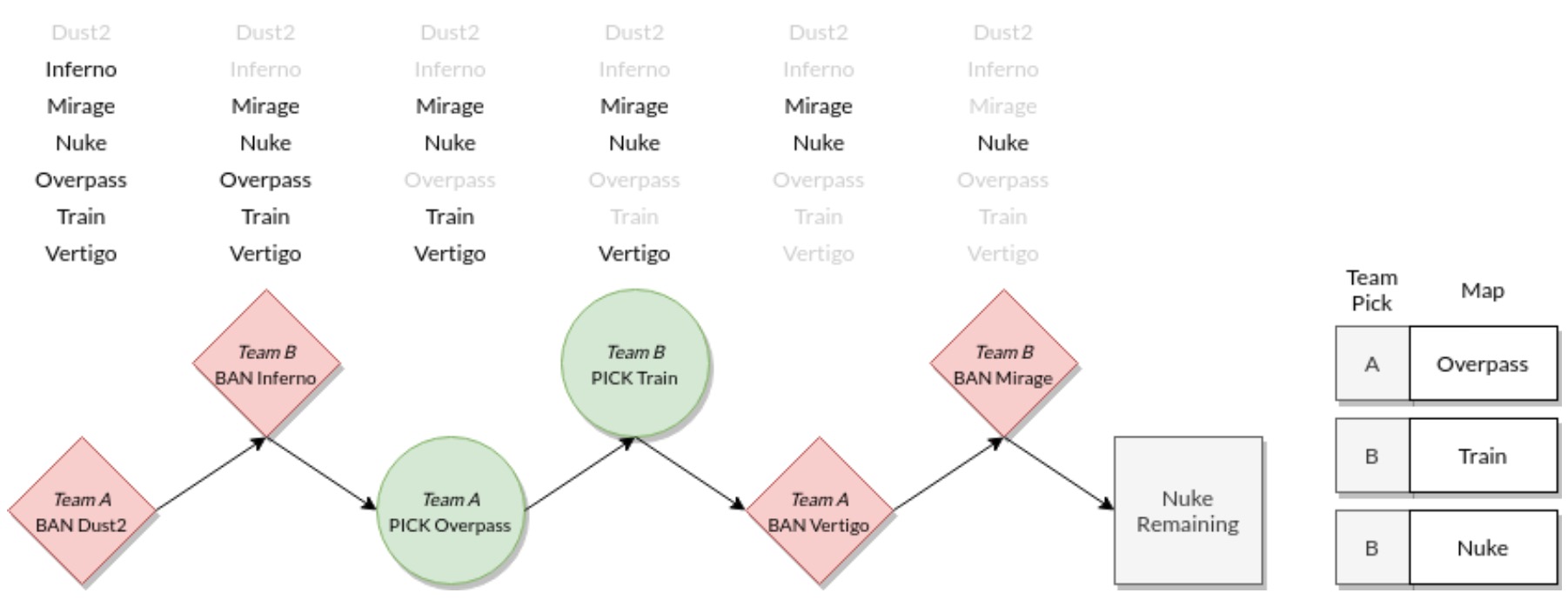 Before two teams even compete, they have to decide what maps to play with a pick and ban process. That is, there is a map pool (of seven maps), and the teams pick the maps that they are best at and ban the ones that their opponents are better at. Of course, this selection is anything but random and the teams should consider how to increase their odds of a win.