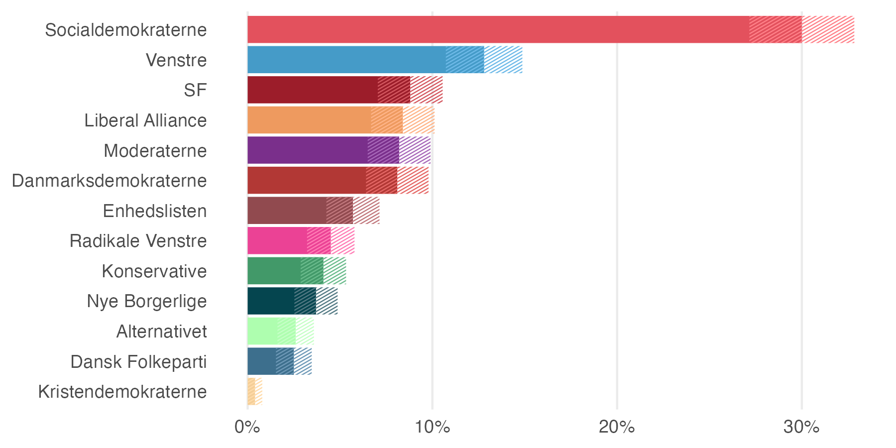 Det fungerer ganske godt med visualiseringen da der ikke alene er fokus på usikkerheden, men at det også naturligt falder i et med selve punktestimatet. Det er således relativt let at aflæse både opbakningen til partiet såvel som de øvre og nedre konfidensintervaller. Det er ikke nødvendigvis en bedre måde at visualisere statistisk usikkerhed, men det bliver aldrig kedeligt at forsøge sig med nye funktioner i R.