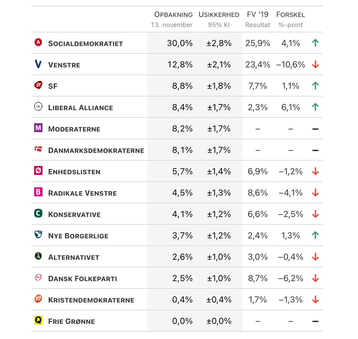 I løbet af de seneste par år har jeg brugt et R-script til at lave en tabel med hver ny meningsmåling, jeg har fundet. Her er et eksempel med en af de seneste meningsmålinger fra Voxmeter (som jeg også brugte et indlæg forleden).