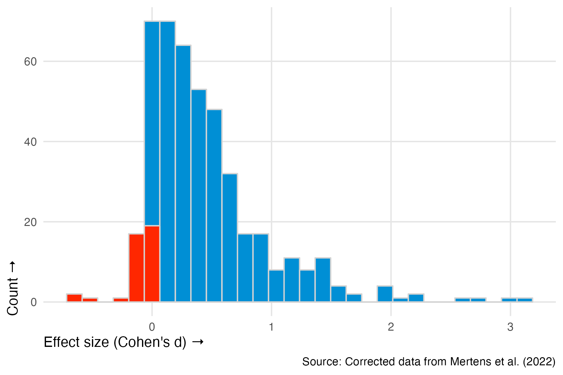 In the figure below, we can see that effect sizes in studies on nudges are not always positive (i.e., in the expected direction). The data is from the meta-analysis by Mertens et al. (2022). 40 out of 447 effects - almost one in ten - are negative (i.e., in the unintended direction). Of course, most of them are not statistically significant, and in several cases they have low statistical power, but we should at least consider what concept(s) we use in our theories and how useful they are in the face of unexpected, unintended effects.