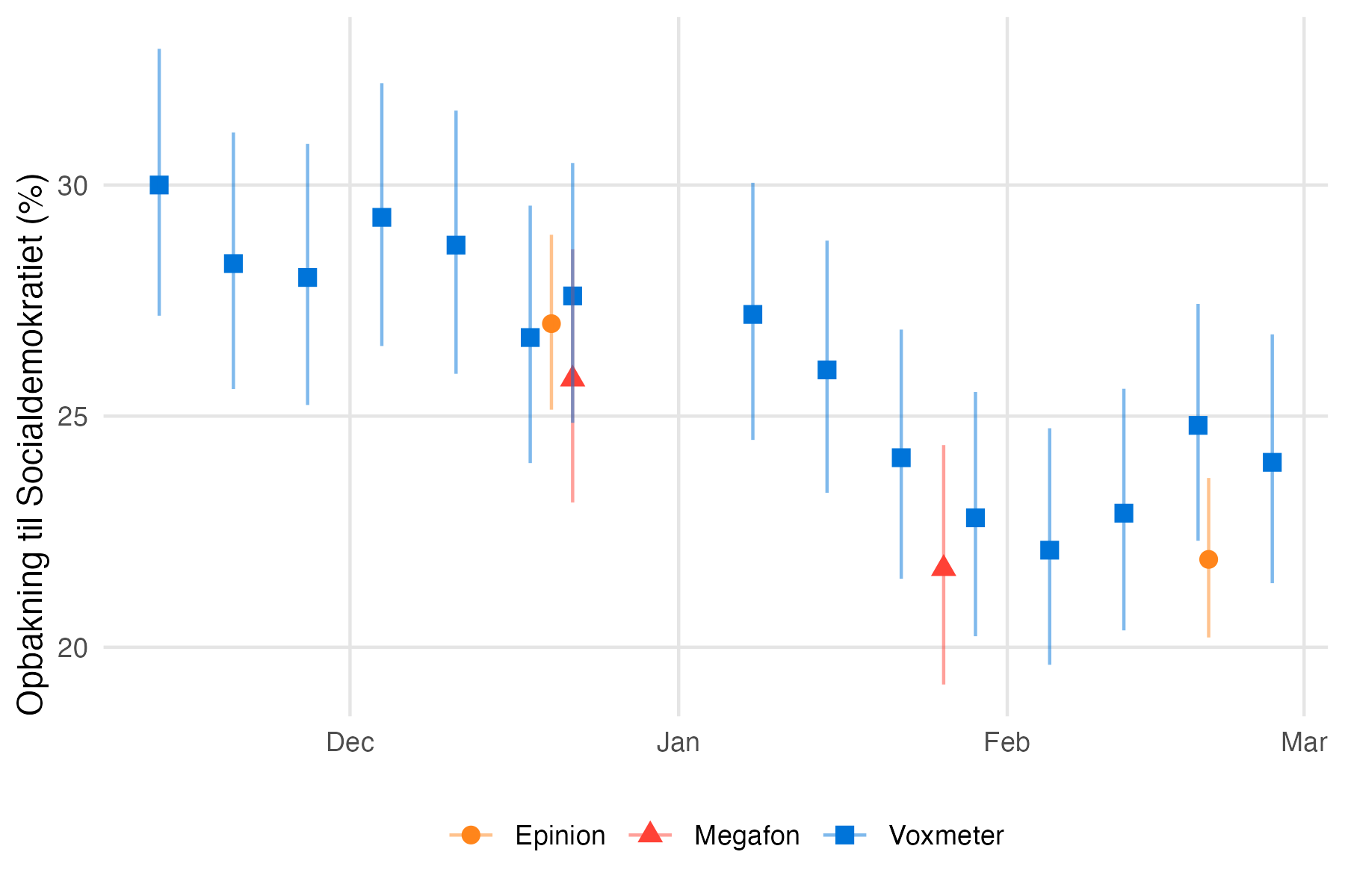 - Socialdemokratiet er gået tilbage. Hvis der var valg i dag, ville Socialdemokratiet efter alt at dømme få en lavere opbakning end de præsterede ved folketingsvalget. I de første meningsmålinger efter valget lå partiet et sted mellem 25-30%, men i 2023 ligger de mere solidt et sted mellem 20-25%. Dette fald er robust på tværs af de tre institutter.