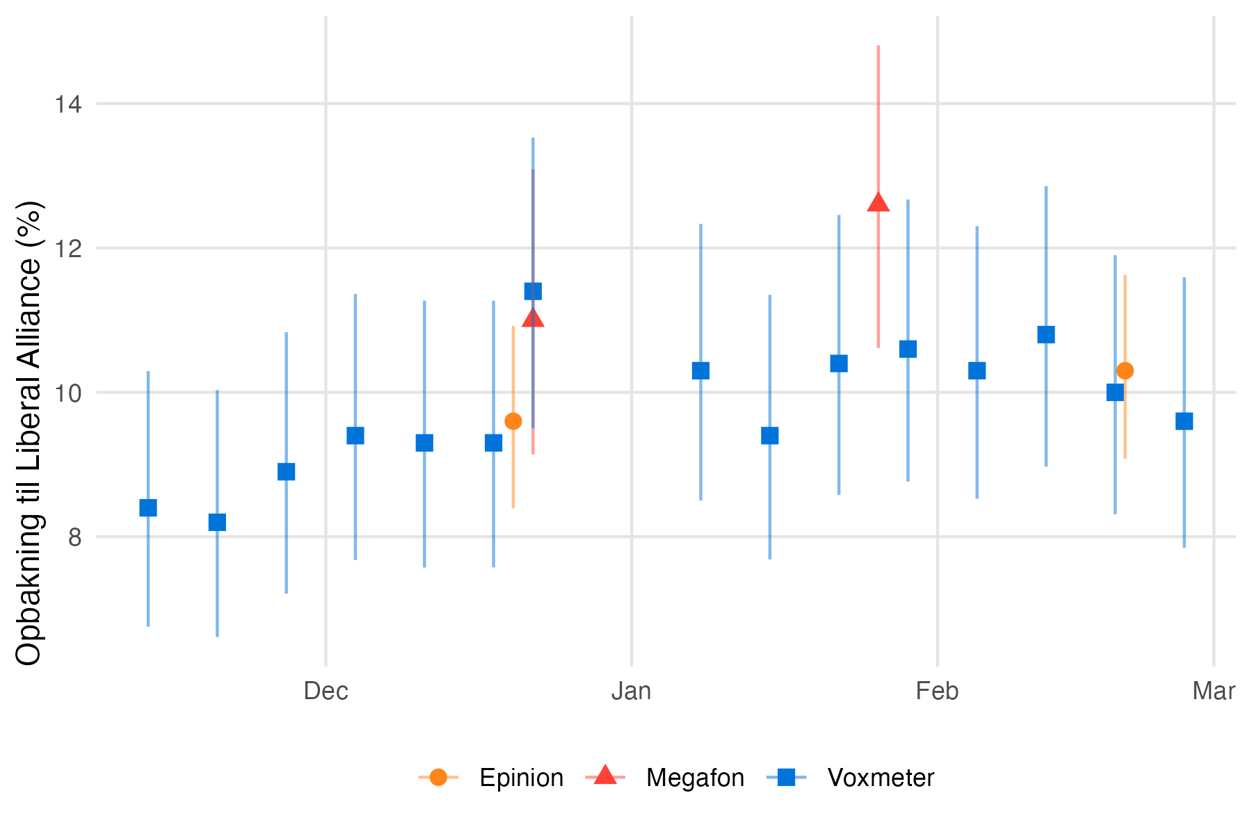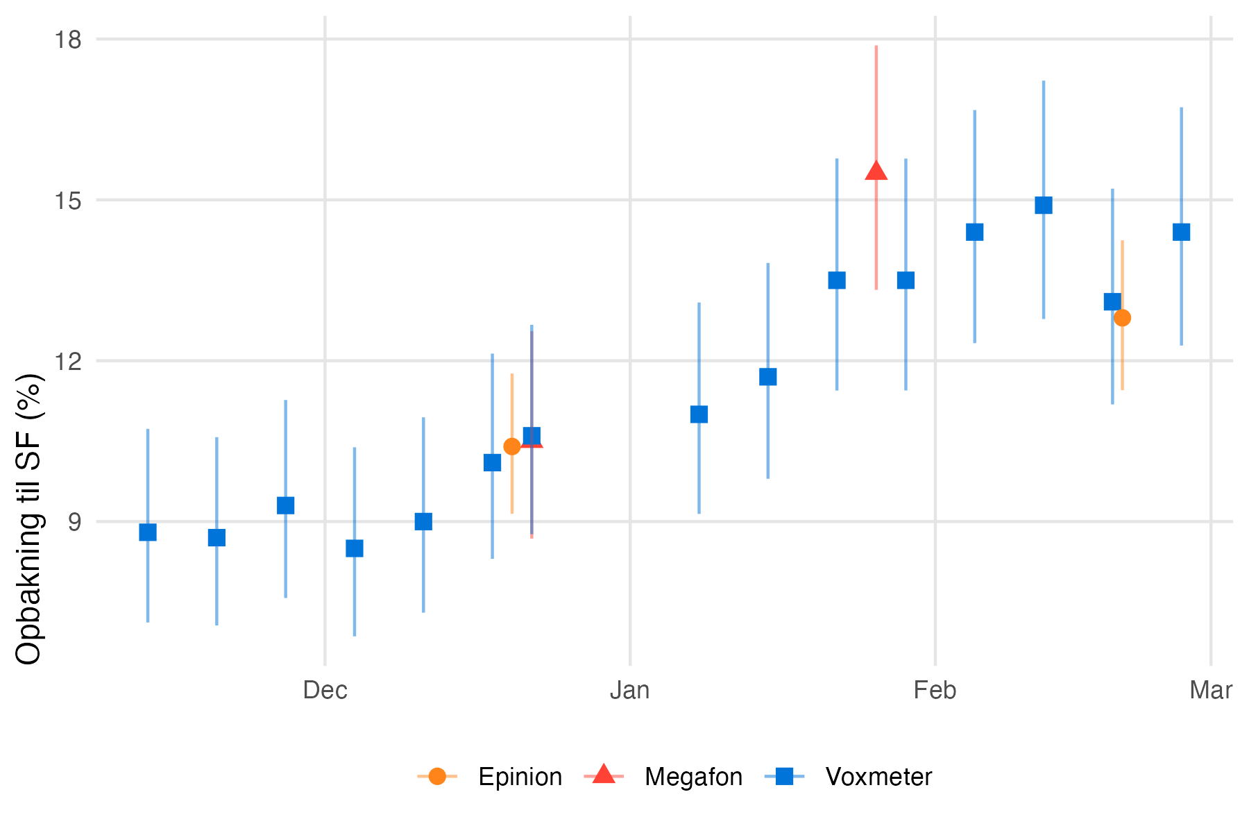 Jeg overvejede at vise 95% konfidensintervaller i ovenstående figur, men jeg finder det mere interessant at kigge på de forskellige estimater fra de respektive institutter snarere end den usikkerhed, der er forbundet hermed.