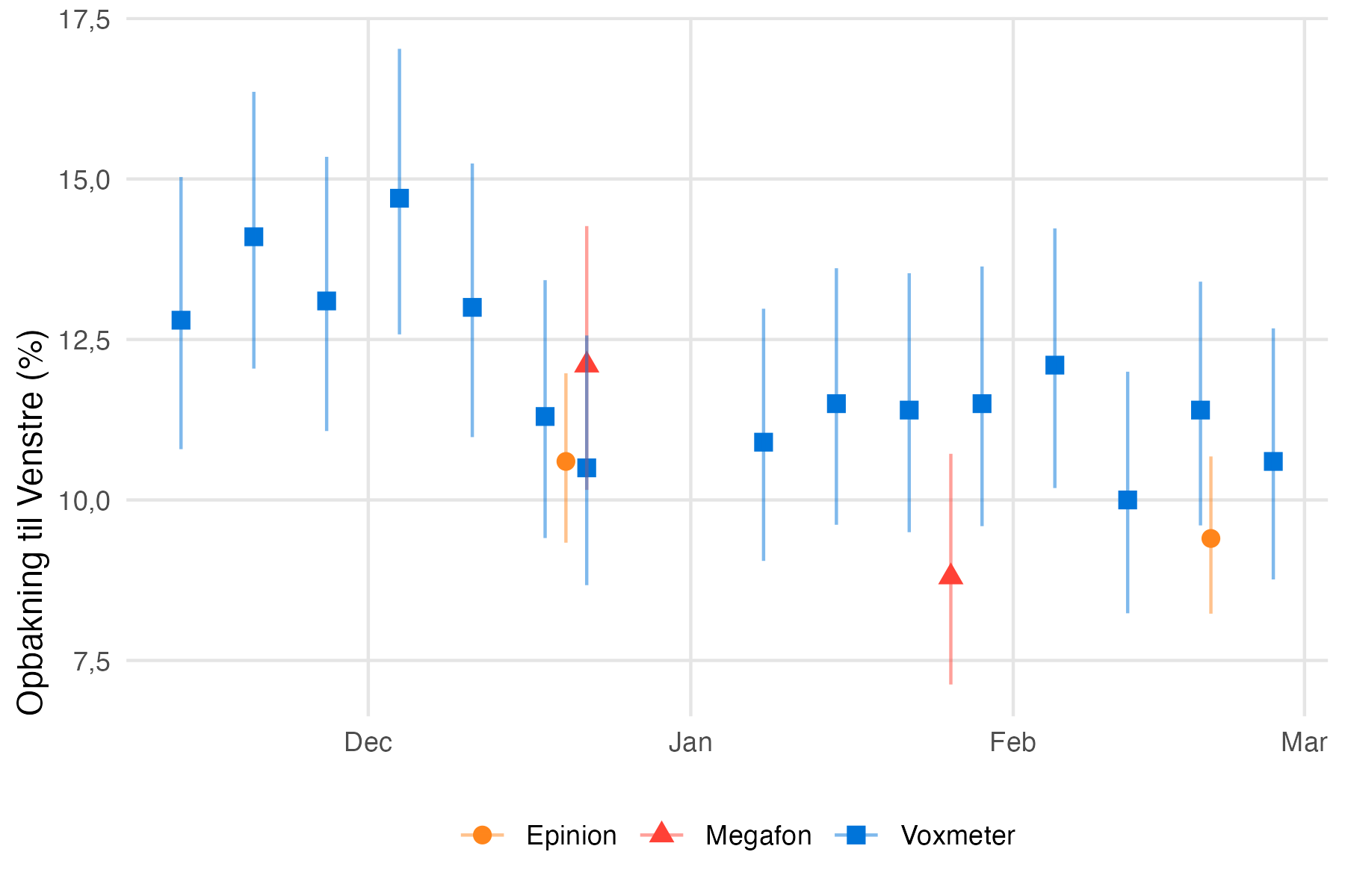 - Der er ikke sket voldsomt meget. Med undtagelse af de ugentlige meningsmålinger foretaget af Voxmeter for Ritzau, har vi kun set et par meningsmålinger fra hhv. Epinion og Megafon (sidstnævnte med TV 2 og Politikens dækning heraf skal man som bekendt forholde sig ekstra kritisk til). Jeg skal ikke kunne sige om hverken YouGov eller Gallup har foretaget meningsmålinger siden valget, men det er i så fald gået min opmærksomhed forbi. For mange af partierne er der ikke sket det store siden valget. Partiernes opbakning er således meget tæt på valgresultatet (med nedenstående undtagelser).