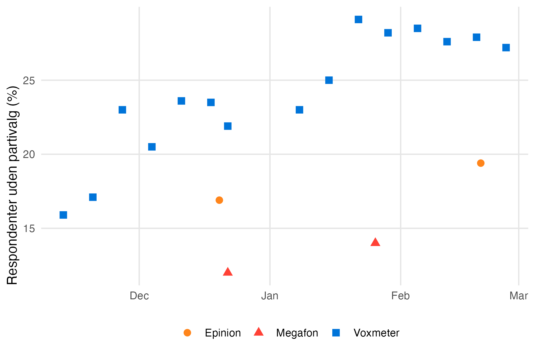 - Flere er i tvivl om deres partivalg. Hvis den nye regering på tværs af de to blokke har medført én ting, er det, at flere enten fortryder deres partivalg eller ganske enkelt er i tvivl om, hvilket parti de ville stemme på, hvis der var valg i dag. På tværs af de tre institutter ser vi således, at en højere andel rapporterer, at de ikke ved, hvem de ville stemme på, hvis der var valg i dag.