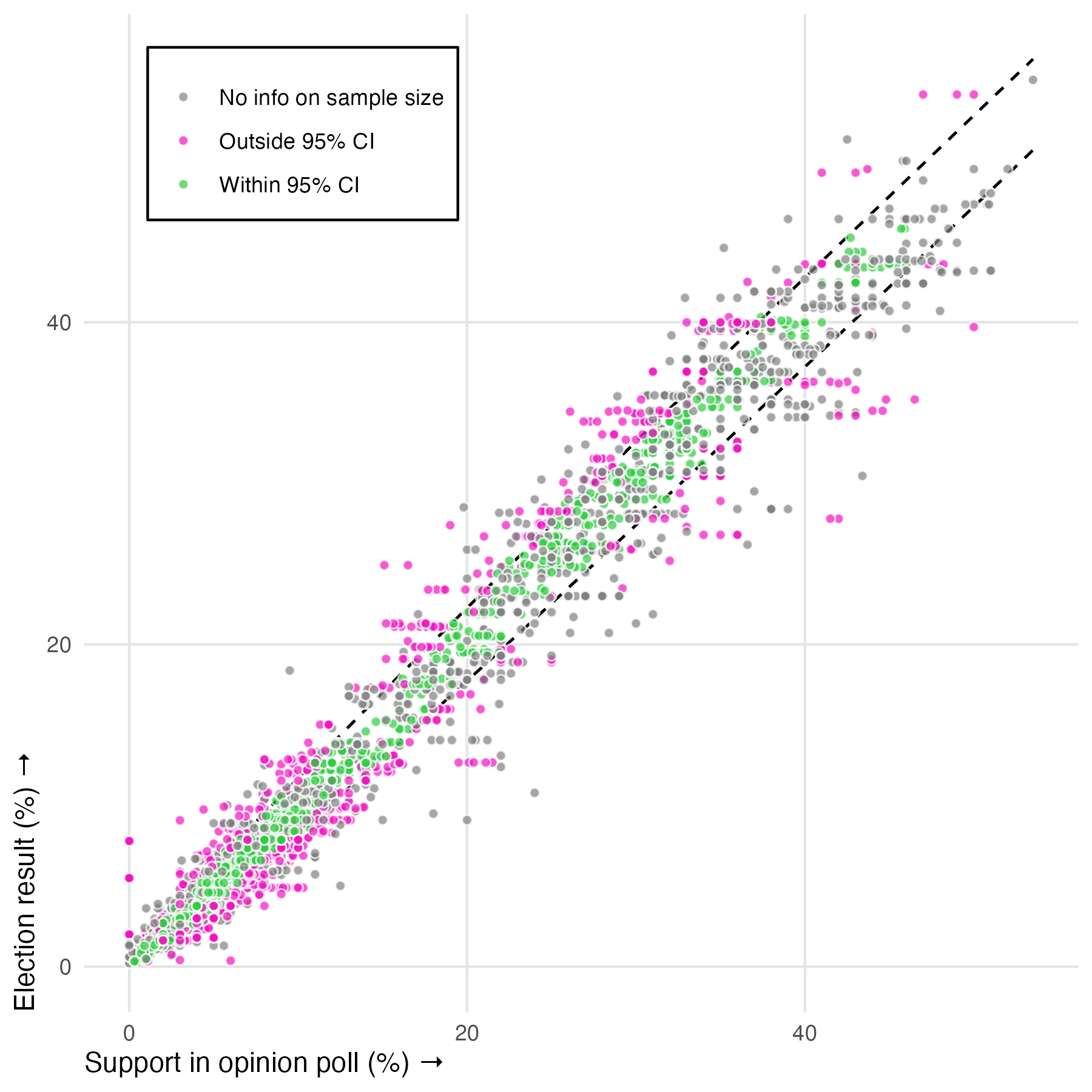 The figure below shows the opinion polls with information on whether the election result in inside or outside the 95% confidence interval. Polls where I do not have information on the sample size are shown with a gray colour. The dashed lines show the 95% confidence intervals of opinion polls with a median sample size (N = 1,201). Accordingly, we prefer the individual observations to have a green colour or/and be within the dashed lines.
