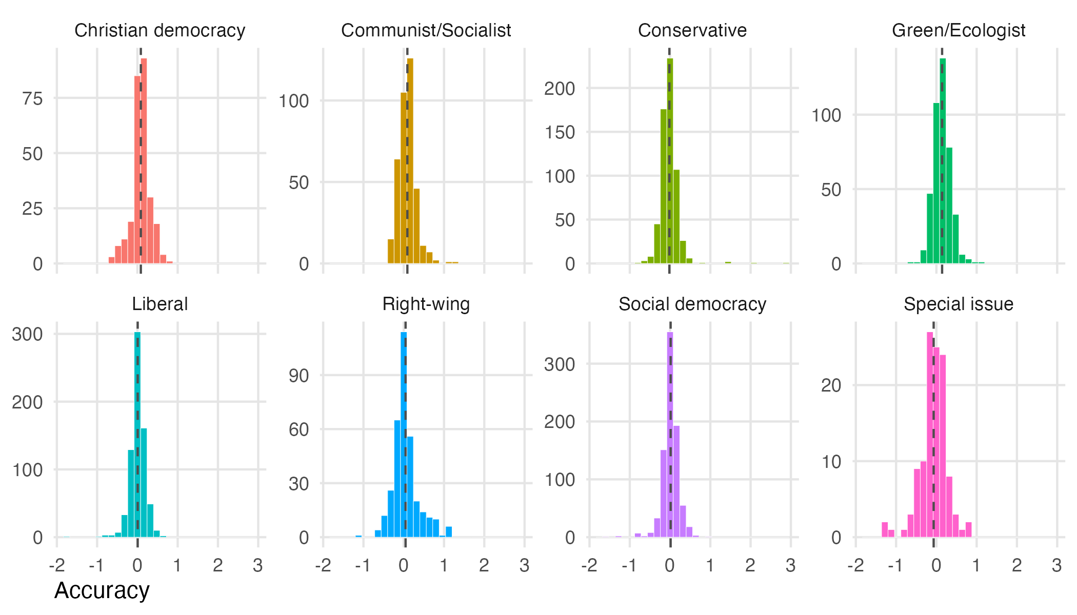The figure below shows the distribution of the estimates within eight different party families: Christian democracy, Communist/Socialist, Conservative, Green/Ecologist, Liberal, Right-wing, Social democracy, and Special issue. In the best of all worlds, we would like all estimates to be exactly 0. In the second-best world, we would like the estimates to be distributed symmetrically around 0 with as little variation as possible. The vertical dashed line within each panel indicates the average accuracy for each party family.