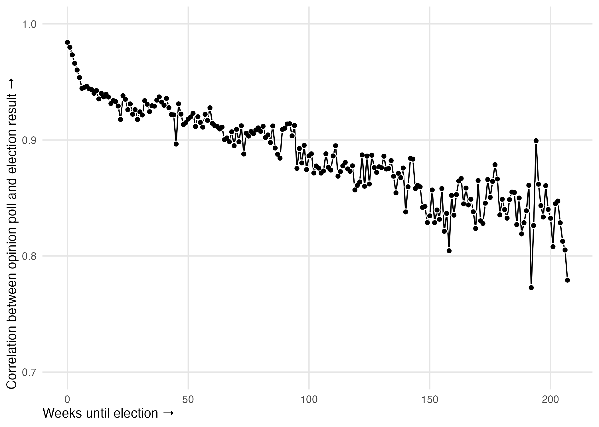 In the figure below, I show the correlation between opinion polls and election results for different weeks. For example, the first point to the left is the correlation in the final week prior to election day. The results are not too surprising here and very much in line with the previous work cited above. The closer we get to election day, the stronger the correlation between opinion polls and the election results. However, even a year prior to election day, opinion polls show - on average - a strong correlation with parliamentary election results.