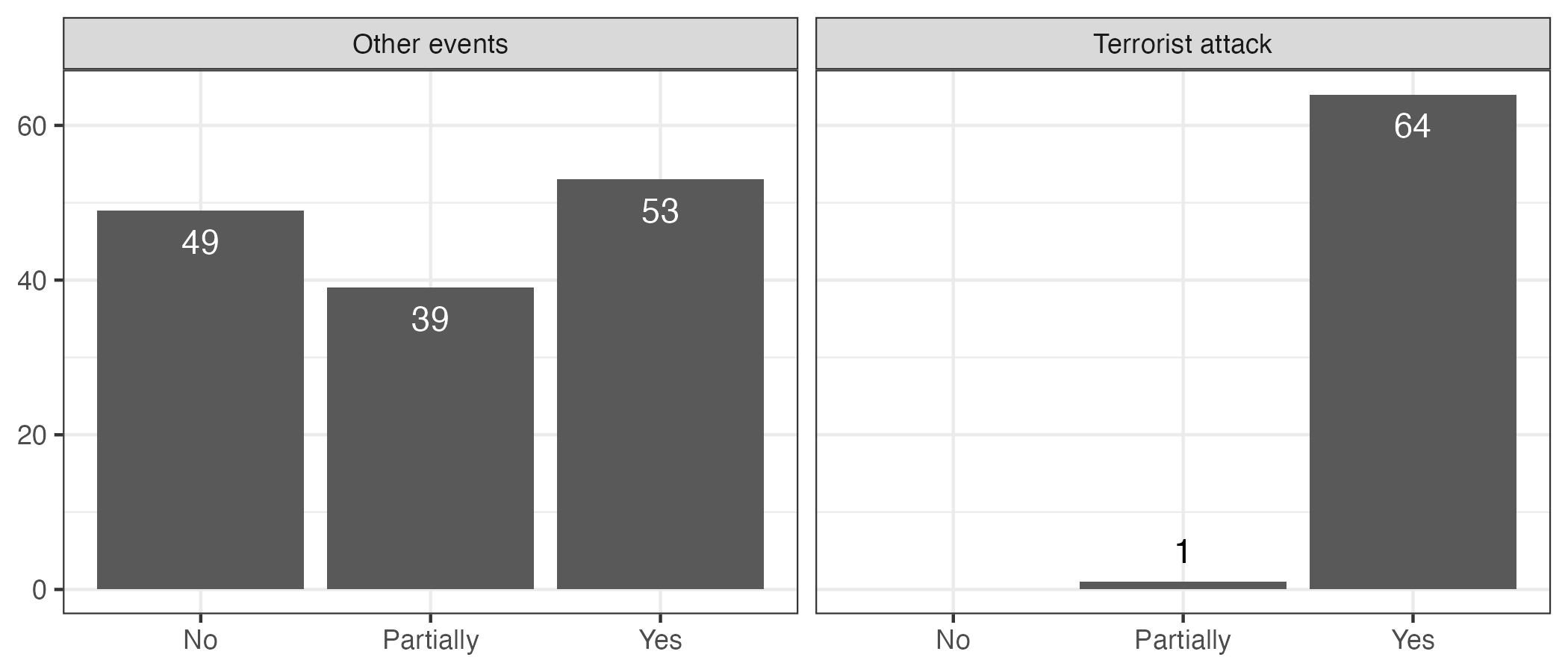 The one study within the domain of terrorism I coded as partially unexpected is Bonilla and Grimmer (2013), as they do not focus directly on terrorist attacks but rather government terror alerts. However, overall, it is fair to say that terrorist attacks are the types of events that are well-suited for these types of research designs where you want to estimate the causal effect(s) of an 'unexpected' event.