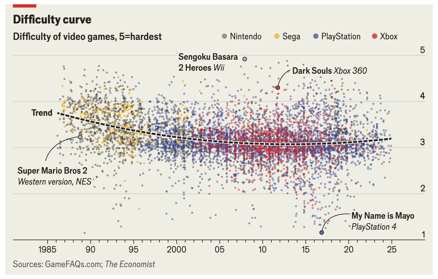 Are video games getting more or less difficult? I don't think this question makes a lot of sense in the first place. It is like asking "Are movies getting better?". There are so many video games being released every year, and there is something for everybody in terms of difficulty, and it is much more interesting to discuss the variation in difficulty within a game rather than the average difficulty of a game (and try to compare this average difficulty year-by-year). For now, I would not make any strong conclusions about changes in video game difficulty over time (or lack thereof) when looking at the chart in The Economist.