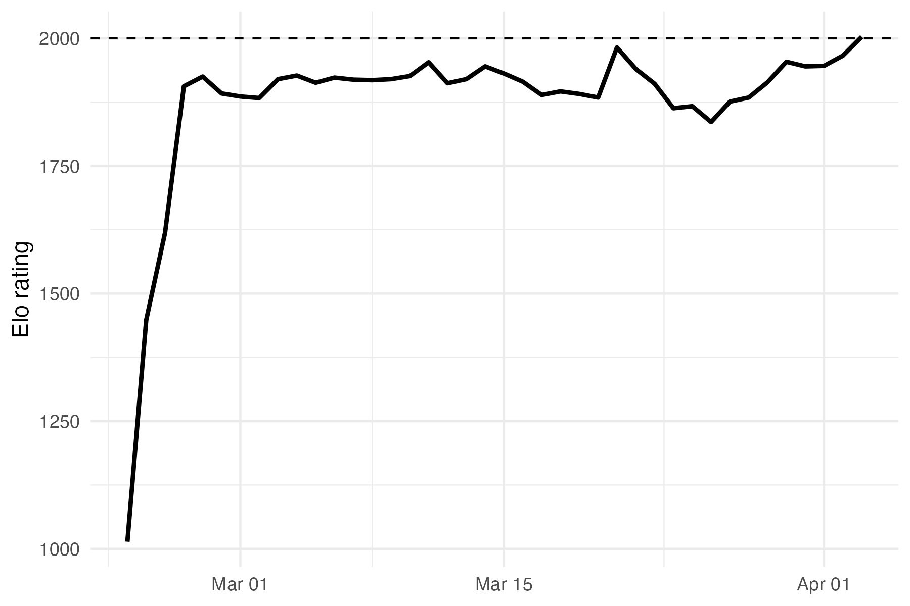 - 90% of the time is spent on the final 10% of the journey. It did not take me more than a few days to get close to 2000, but getting from 1900 to 2000 took a long time. Most of the time was spent playing against people at my level and - conditional upon who I was paired with - moving closer to or away from 1900. Here is an overview of my daily max Elo: