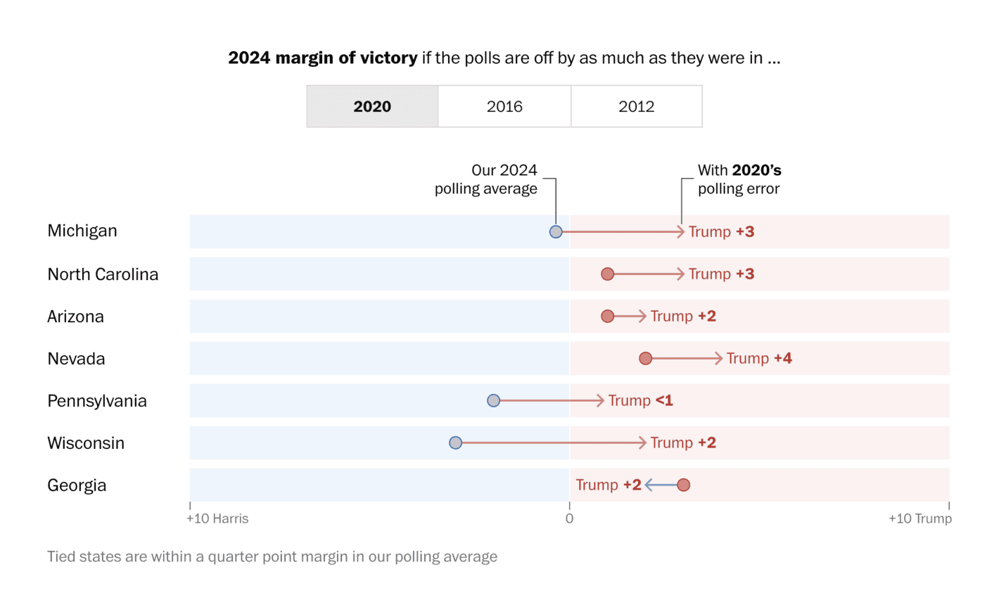 Another visualisation with "what if the polling error is as large in 2024 as in 2020", but I find this one a bit more complicated to follow. Not a bad visualisation at all, but I believe there are better ways to illustrate these what if scenarios (as described above).