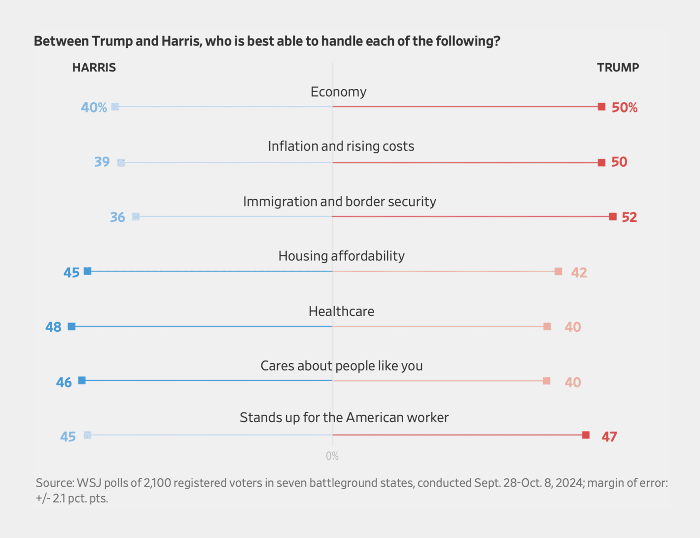 I do get the idea with this figure. That is, use the colours to emphasise whether voters believe Trump or Harris are better at dealing with particular issues.
