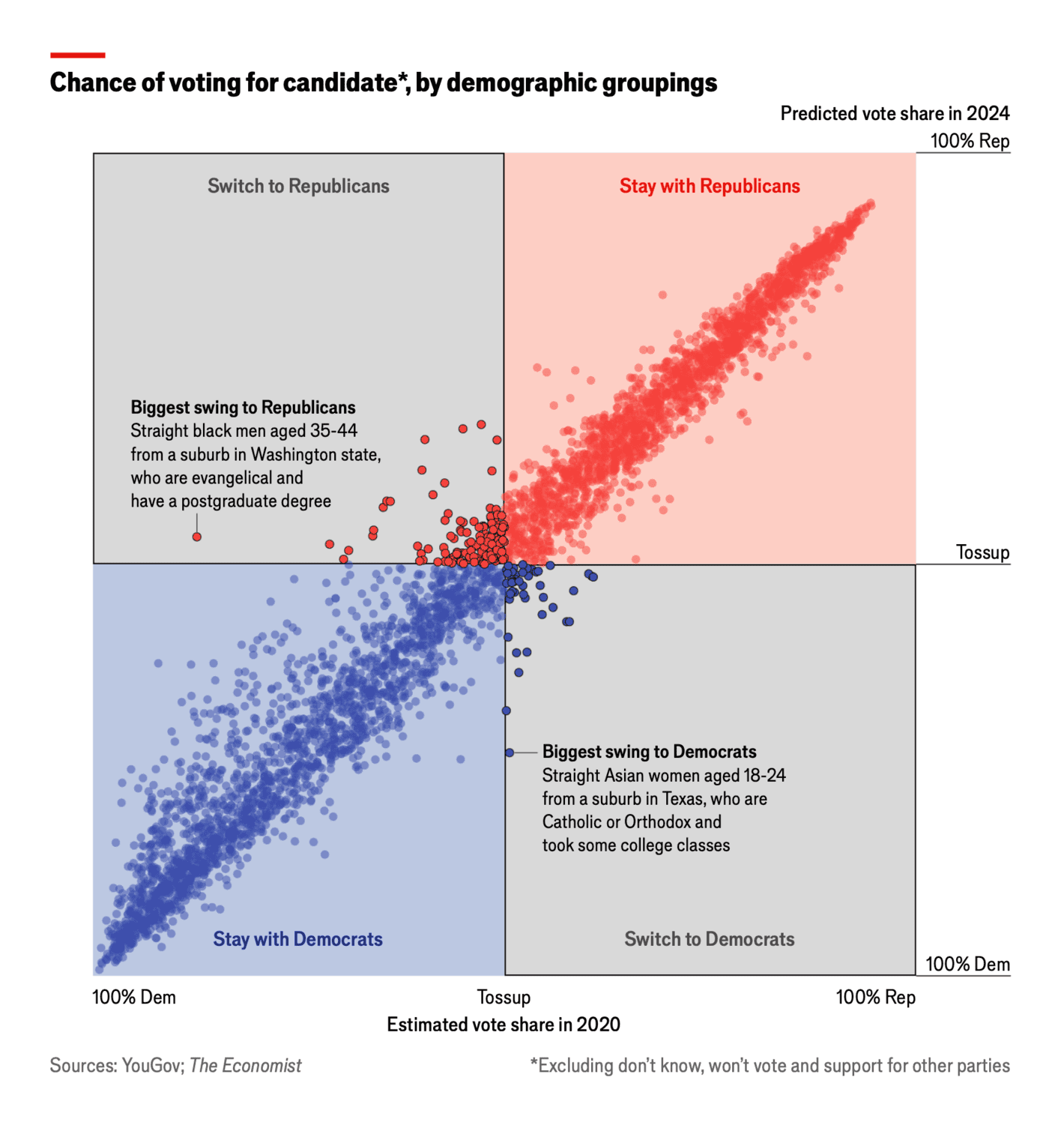 A visualisation of the various correlates of support for Harris and Trump. I do not like these types of "kitchen sink" visualisations. I can imagine that the treatment of don't knows for some of these items will also matter a lot. But as a bar chart visualisation of data I guess it is OK.
