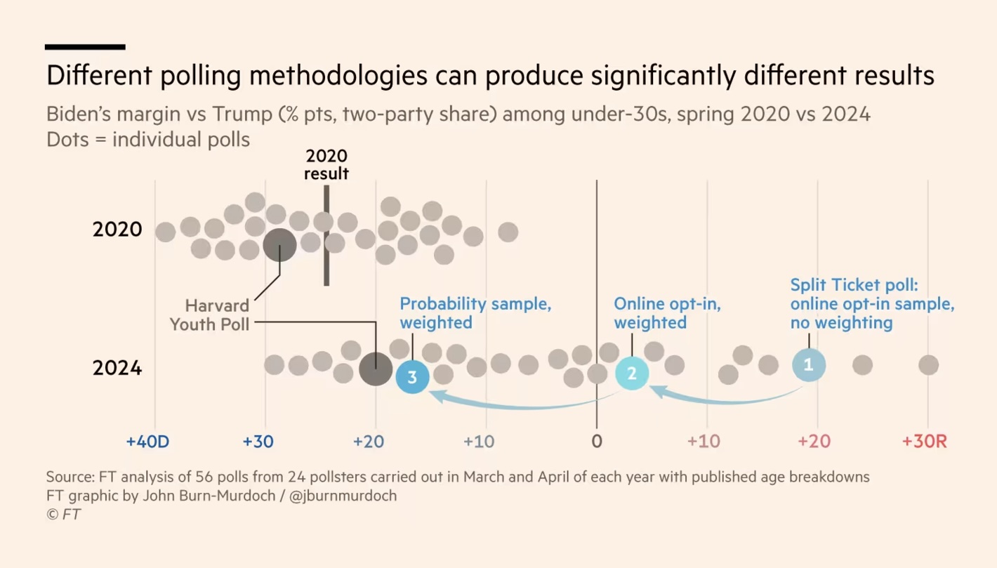 A great visualisation of the relevance of polling methodologies in explaining the differences in what polls show. That is, there are systematic differences between polls and we can disentangle the house effects and understand how specific techniques contribute to differences between pollsters. I had a similar idea years ago for Danish polls, but it was simply not possible (too few pollsters, limited details on methodologies, etc.).