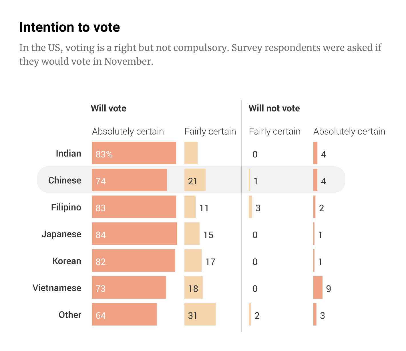 A lot of bars in this visualisation and difficult to infer the main point (if there is any). Maybe it should have a better title than "Intention to vote"? Or maybe it is just the inherent limitations of using self-reported intention to vote data that makes me less interested in this visualisation overall? In any case, I am not convinced this is the best way to visualise this data.