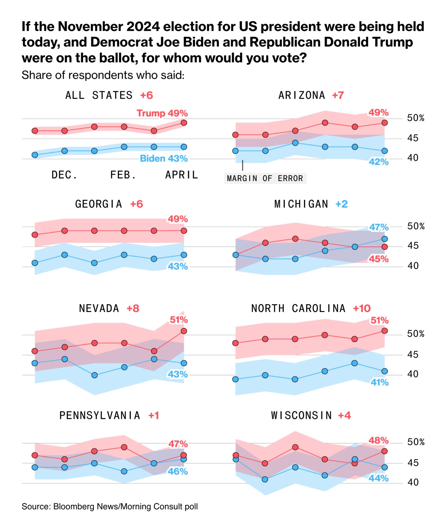 This is such a great way to visualise the results from a single poll. You have the results from different states presented with the margin of error and the margin between the two candidates, but you also include the information on the polling average (in this case from the 538 Polling Average). I really like it when the visualisation of a poll also manages to provide the context in the form of the average of other polls.
