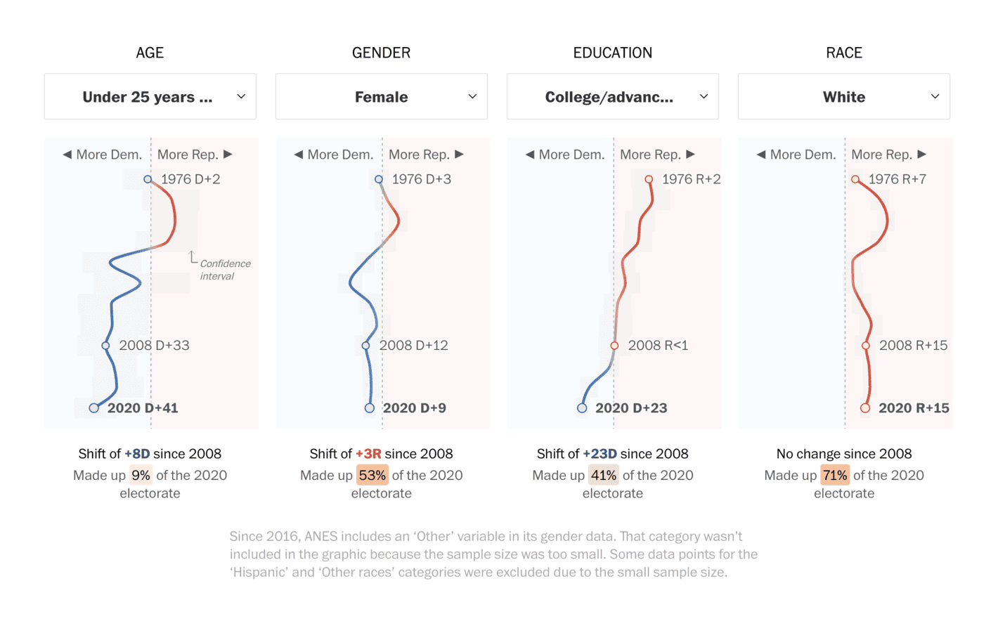 Not a bad visualisation but it can be difficult to interpret the numbers here. How many voters are we talking in the specific groups? And if we consider self-reporting turnout and other limitations, I am not sure there is a lot of interesting material to get out of this visualisation. In other words, too many numbers and some unlikely assumptions that should hold for these numbers to be of any interest.