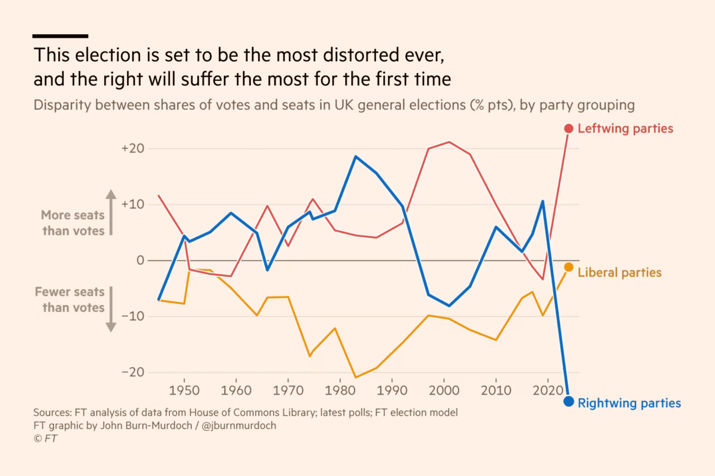 It is not easy to transform polls into seats based upon national polls in a FPTP voting system, and any visualisation trying to show the discrepancy between votes and seats should at least try to convey some notion of uncertainty. That being said, what I primarily do not like about this visualisation is how specific dataviz gimmicks are used to emphasise the difference (e.g., letting the numbers go below the x-axis values).