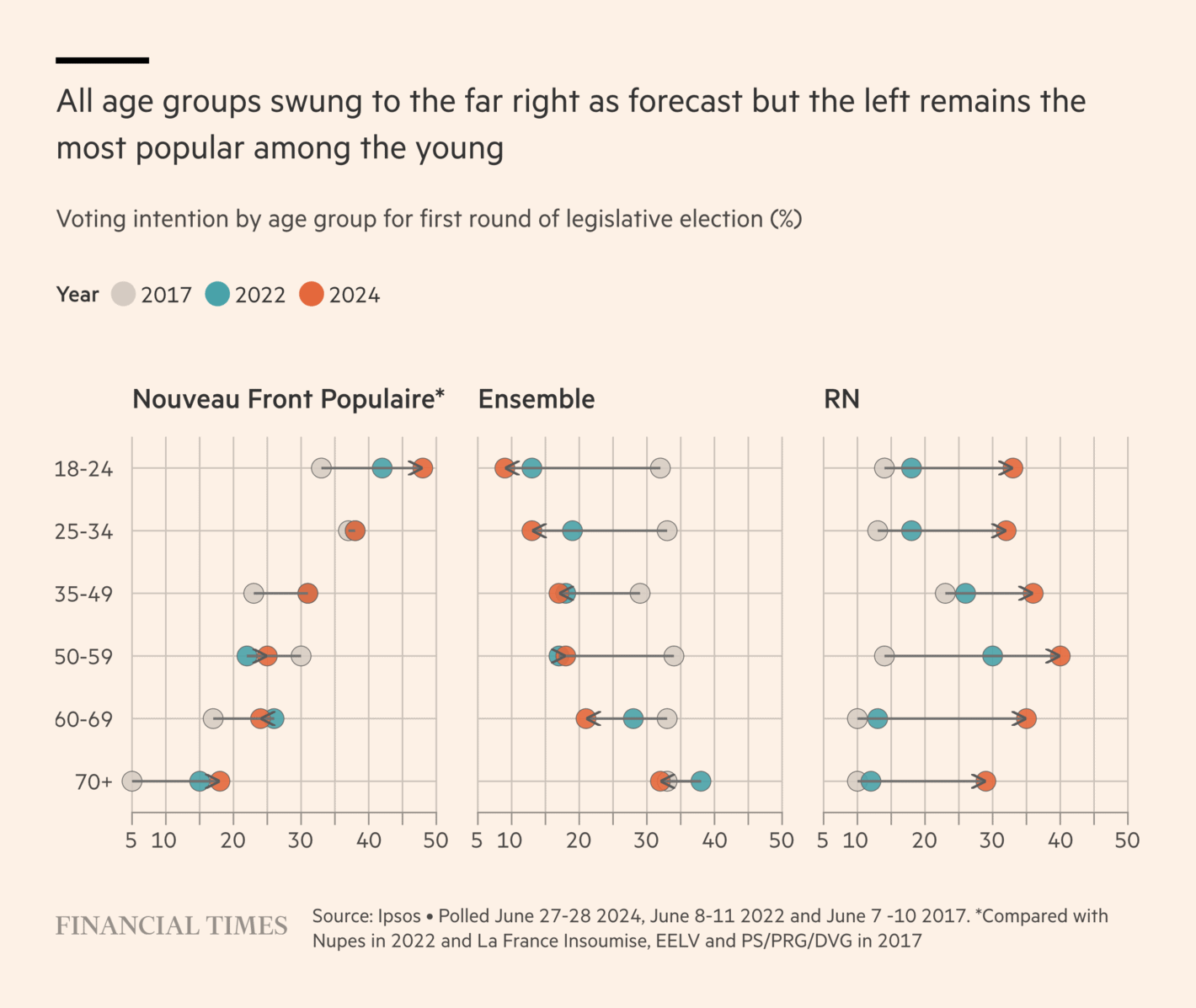 For the 2024 French elections, The Economist made several visualisations, and this is an example of the projected seats in their forecast (based on the polls). What I like about this visualisation is not only its simplicity but also its focus on the likely range and not a point estimate. While creating a forecast involves many technical details, the reporting of the key figures need not be more than a few key numbers (and then the details can be in the methodological appendix for those who are interested in the details).