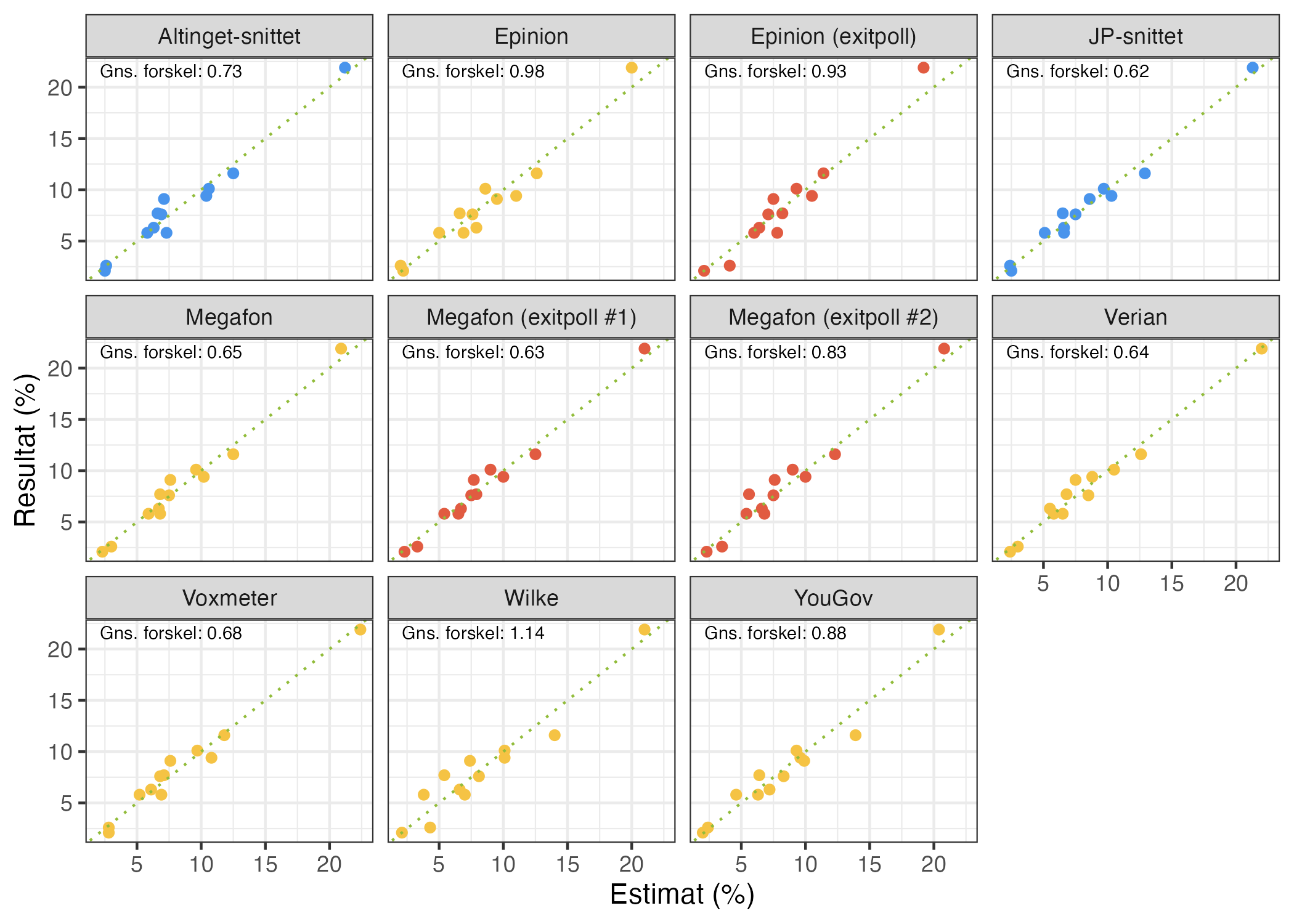 I den næste figur kigger vi på relationen mellem estimat og resultat for hvert af de respektive institutter og snit. Jo tættere punkterne ligger på den stiplede linje, desto bedre. Vi fokuserer her ligeledes på den gennemsnitlige forskel, hvor lavere værdier er bedre (en værdi på 0 ville indikere, at alle estimater ramte valgresultatet perfekt).