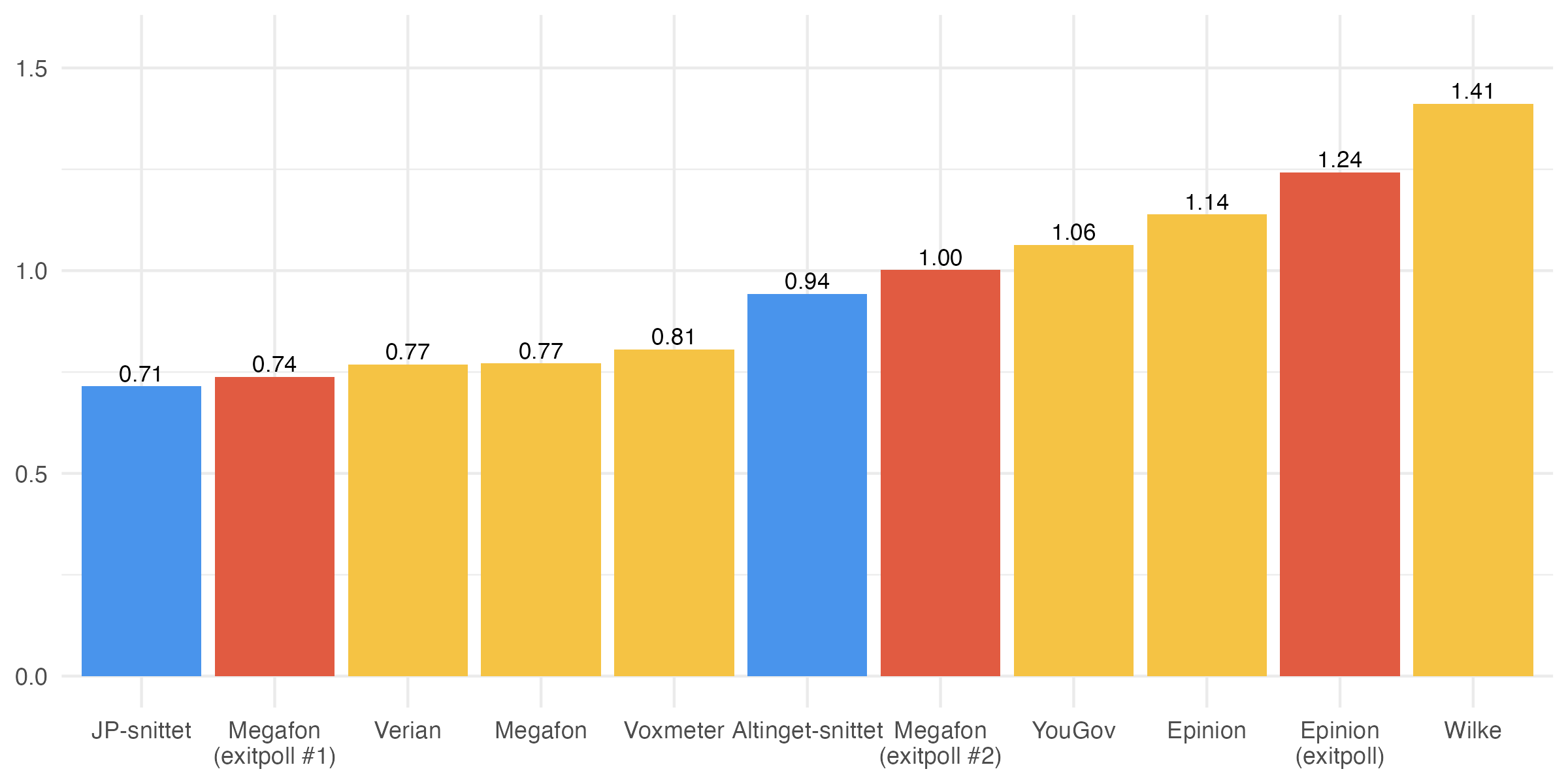 Vi skal for en god ordens skyld her også kigge på kvadratroden af den gennemsnitlige kvadratafvigelse. Logikken er, at større afvigelser betyder mere for, hvor godt en måling har klaret sig. Det vil sige, at det er mere problematisk at ramme ét parti forkert med 0,5 procentpoint end fem partier forkert med 0,1 procentpoint. Disse tal er vist i figuren nedenfor.