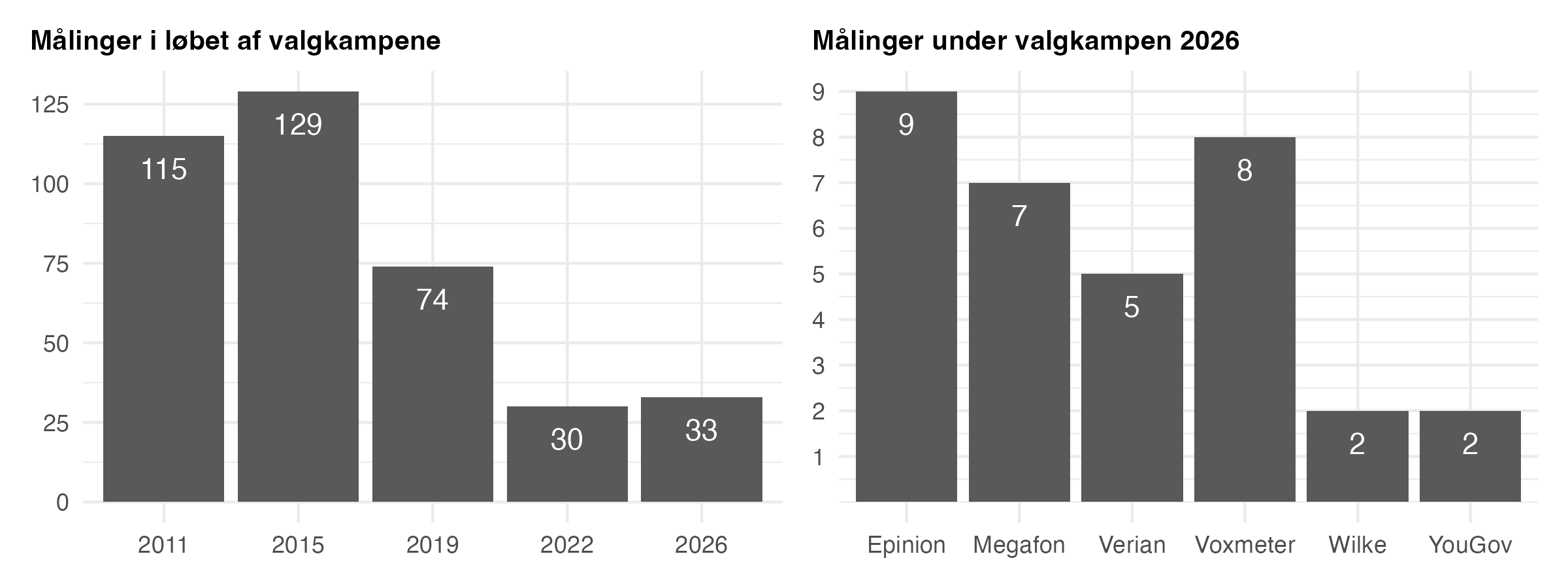 Før vi kigger på, hvordan snittet klarede sig, er det godt at forholde sig til, hvilke og hvor mange meningsmålinger, der blev brugt fra valgkampen. Meningsmålingerne kan fylde meget i en valgkamp, men hvis du mener, at der var mange meningsmålinger i denne valgkamp, har du med al sandsynlighed glemt, hvordan det var for år tilbage. I nedenstående figur ser vi 1) antallet af meningsmålinger der blev foretaget i løbet af de seneste fem valgkampe (fra 2011 til 2026) og 2) antallet af meningsmålinger fra de respektive institutter i løbet af den netop afsluttede valgkamp.